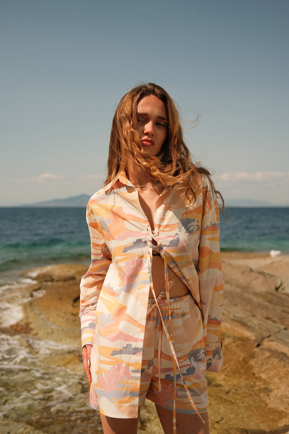 SUNSET deseni, İlkbahar Yaz 2025 koleksiyonunun teması olan Aftersun Island’dan ilhamla hazırlandı. Gün batımının sıcak tonları ve yumuşak geçişleriyle şekillenen bu desen, adanın gün sonunda bıraktığı hissi yansıtır. El çizimi formlar dijital baskı yöntemiyle kumaşa uygulandı; bu sayede renk geçişleri ve detaylar canlılığını uzun süre korur.