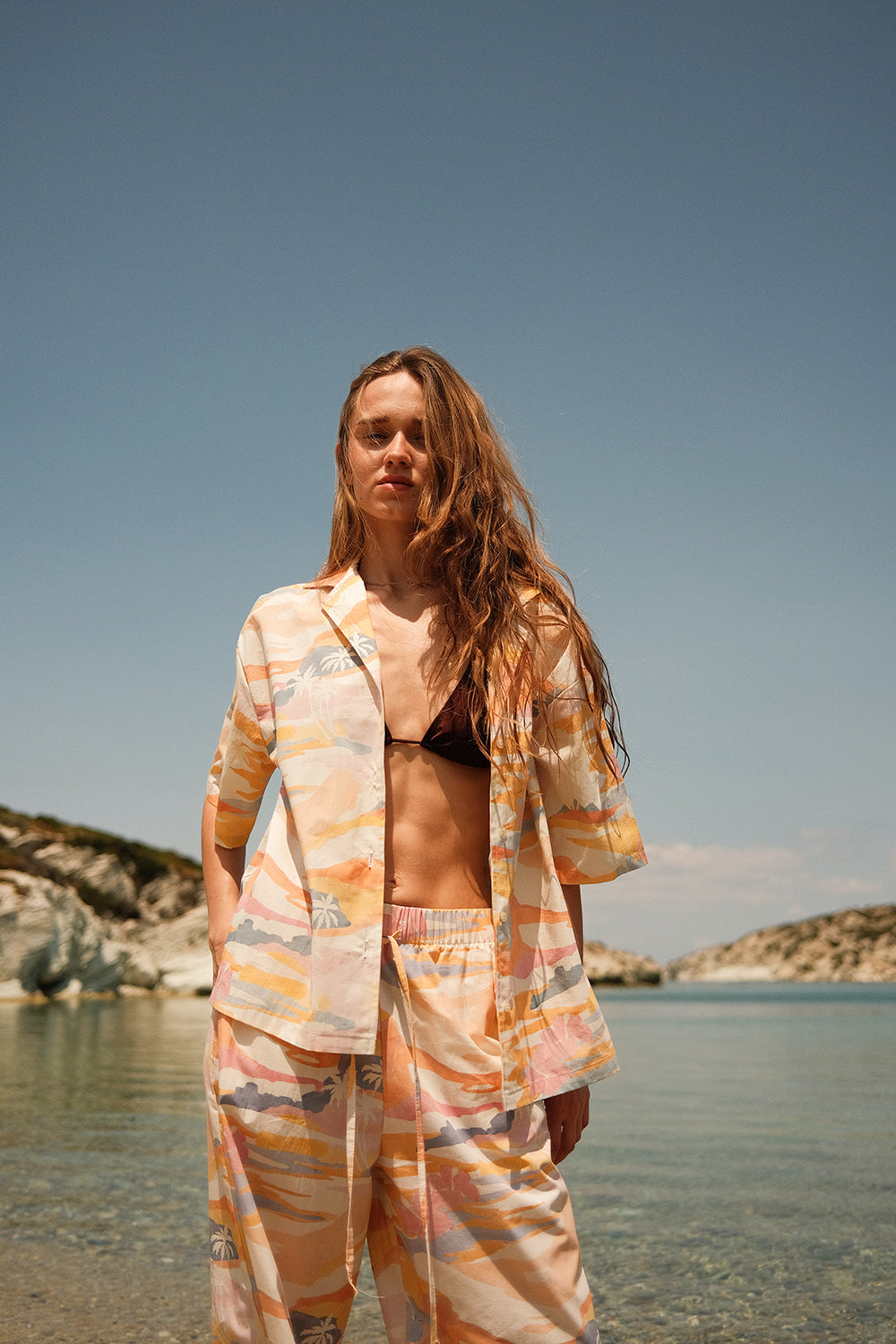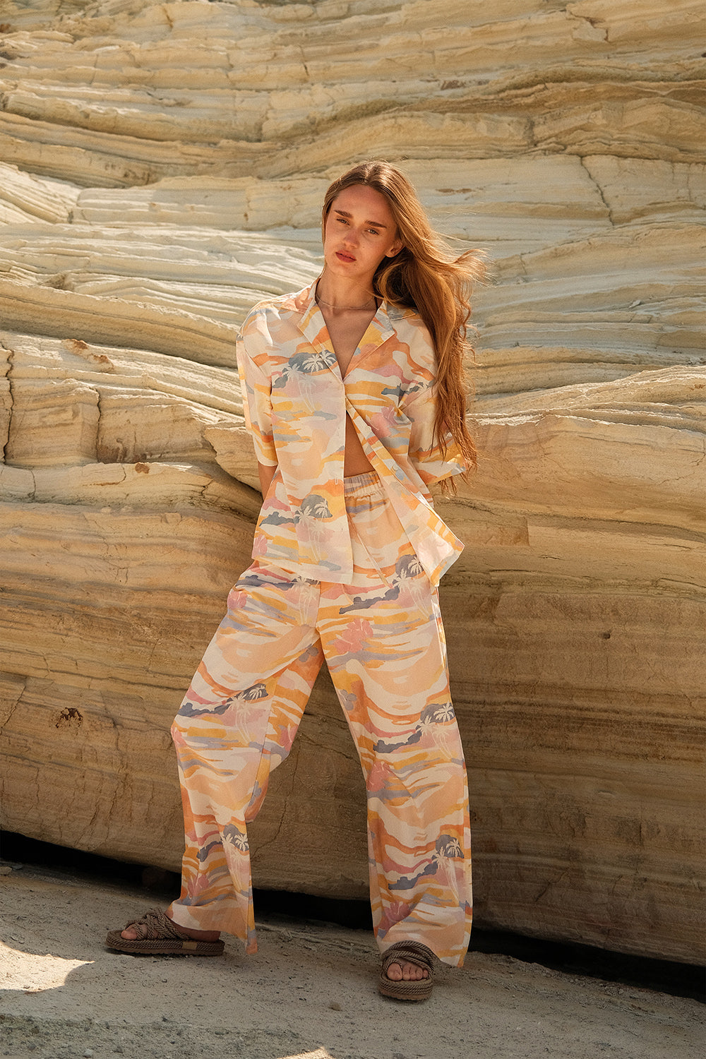 SUNSET deseni, İlkbahar Yaz 2025 koleksiyonunun teması olan Aftersun Island’dan ilhamla hazırlandı. Gün batımının sıcak tonları ve yumuşak geçişleriyle şekillenen bu desen, adanın gün sonunda bıraktığı hissi yansıtır. El çizimi formlar dijital baskı yöntemiyle kumaşa uygulandı; bu sayede renk geçişleri ve detaylar canlılığını uzun süre korur.