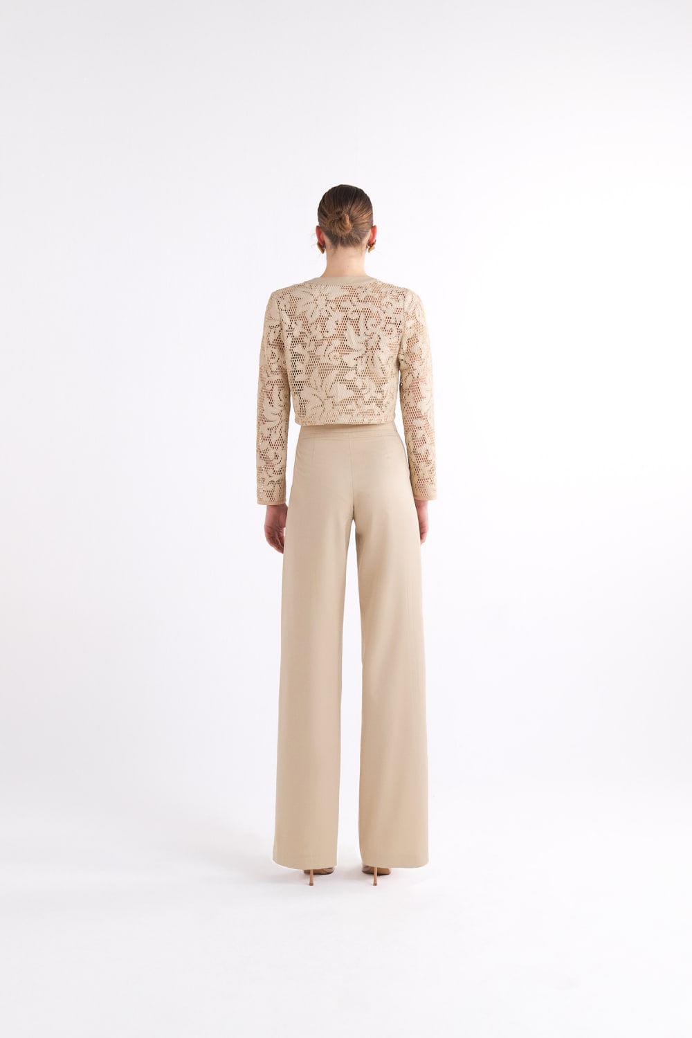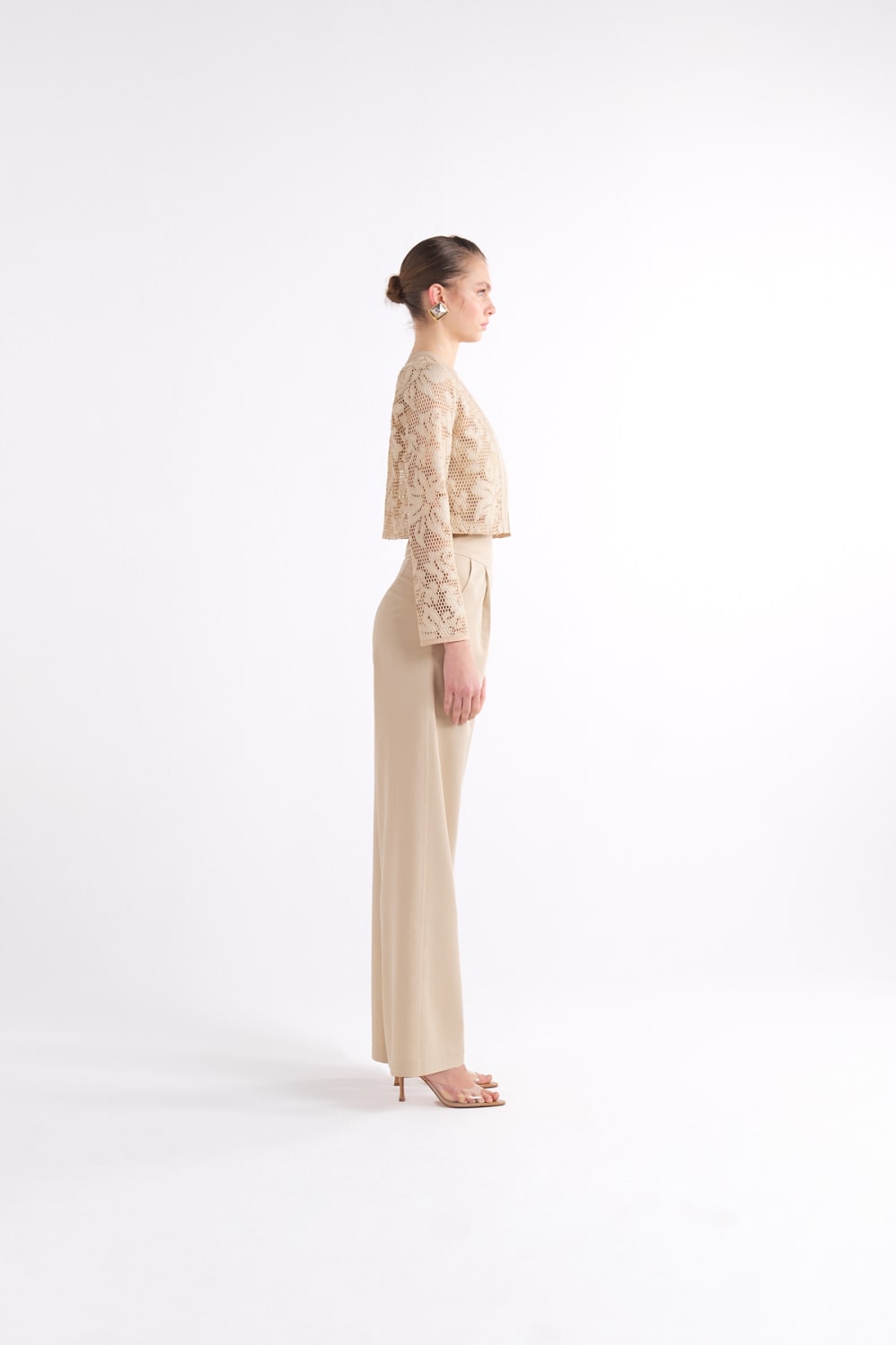 Tamamen dantel işlemelerle tasarlanmış kolları ve ön yüzeyiyle romantik bir görünüm sunuyor.