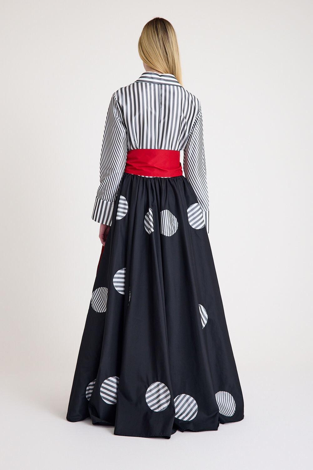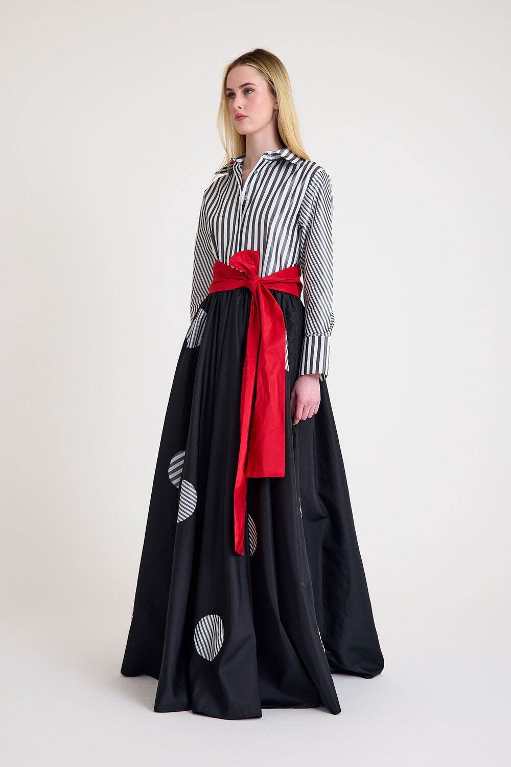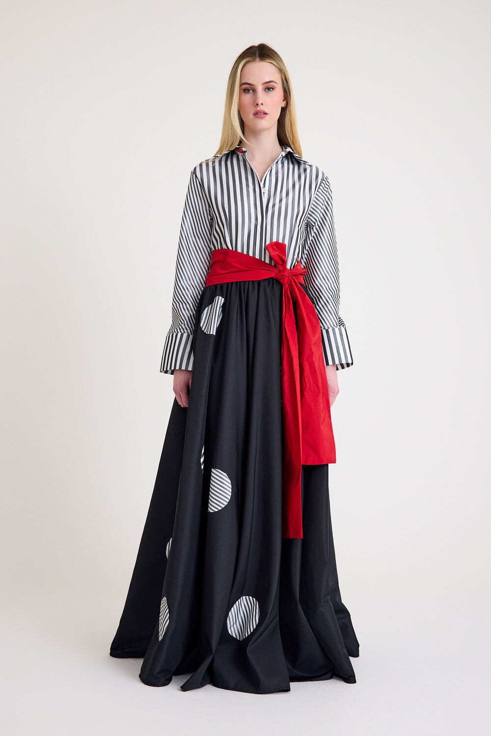 Çizgili Kumaştan Puantiye Detaylı Maxi Boy Couture İşçilikli Tafta Gömlek Elbise