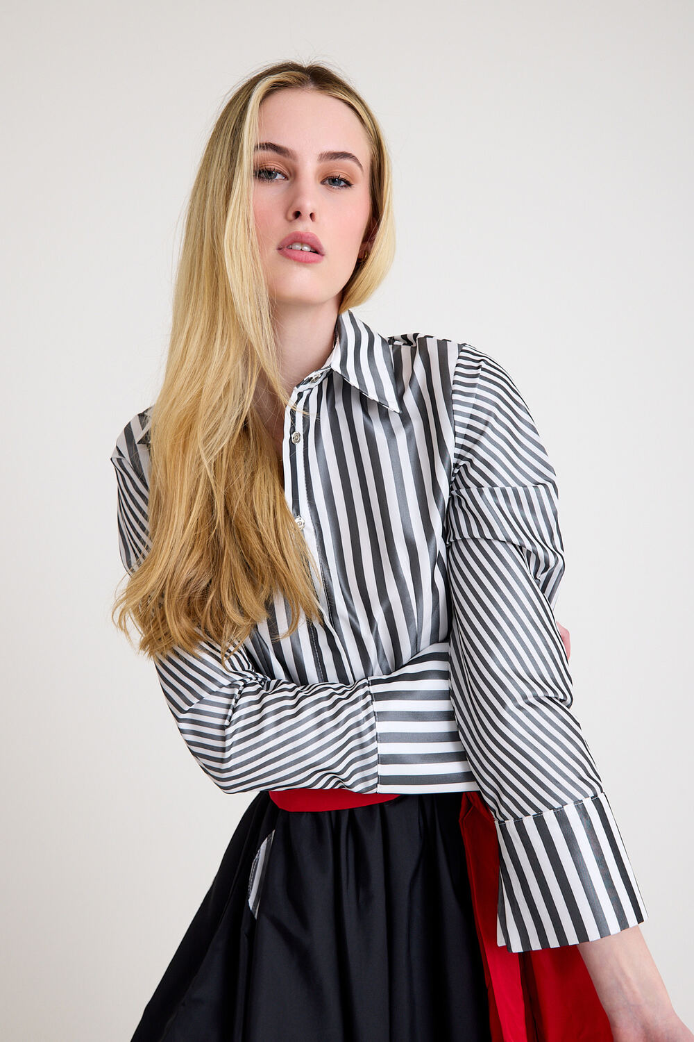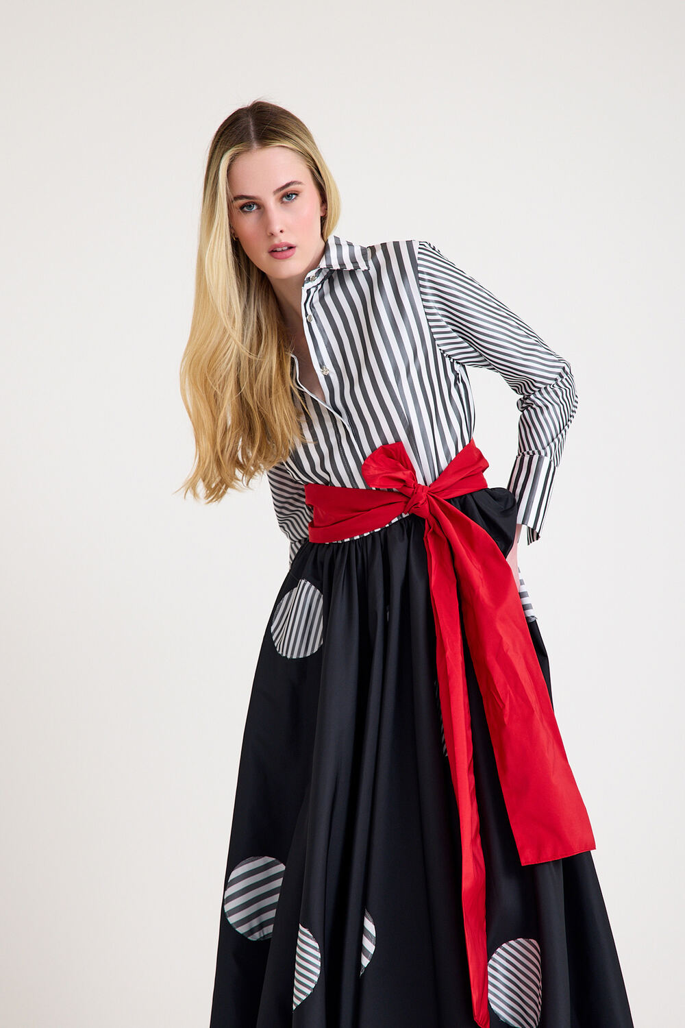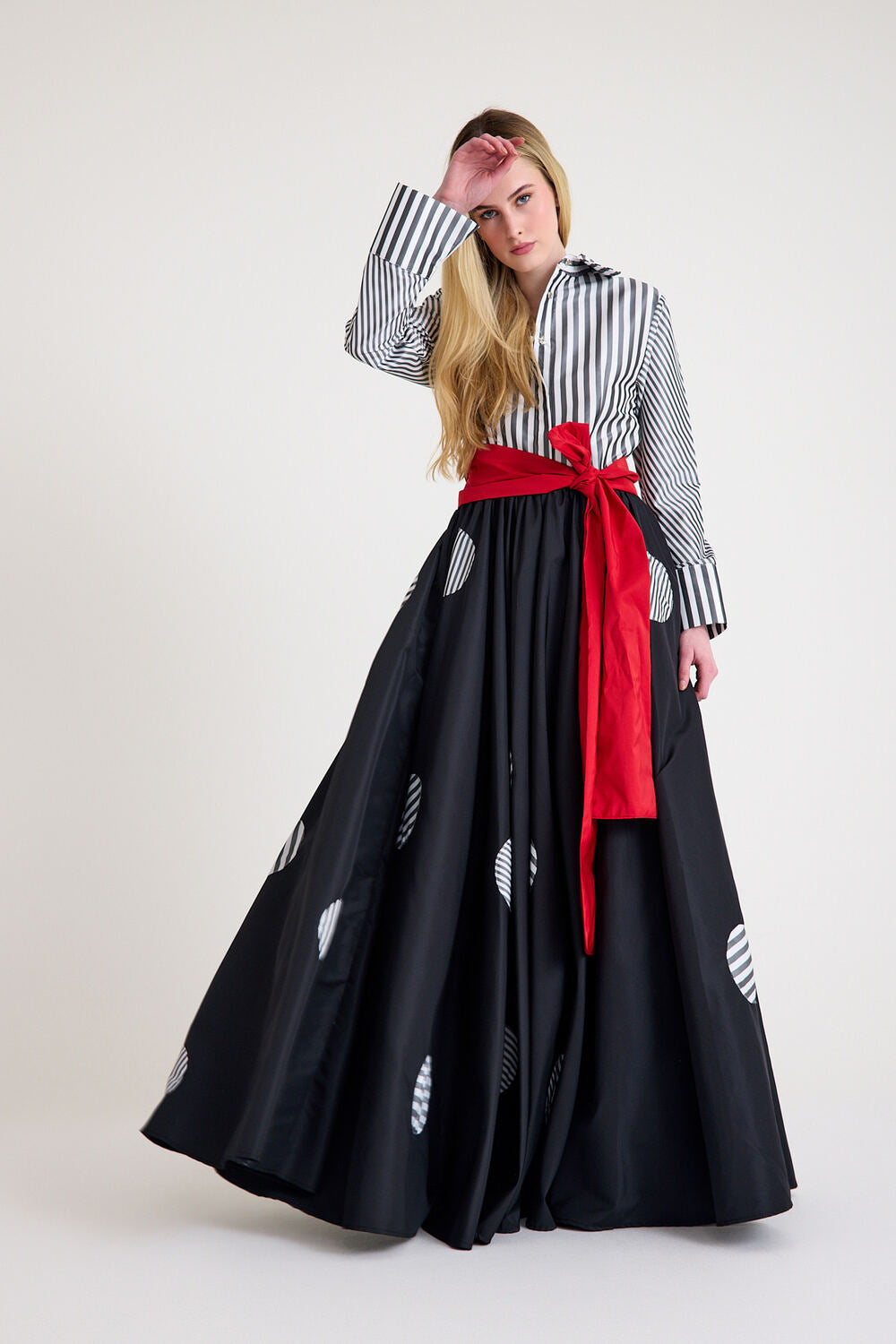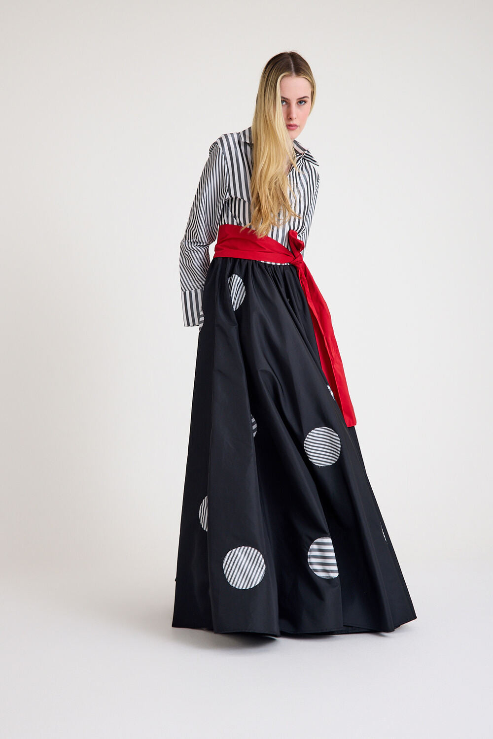 Çizgili Kumaştan Puantiye Detaylı Maxi Boy Couture İşçilikli Tafta Gömlek Elbise
