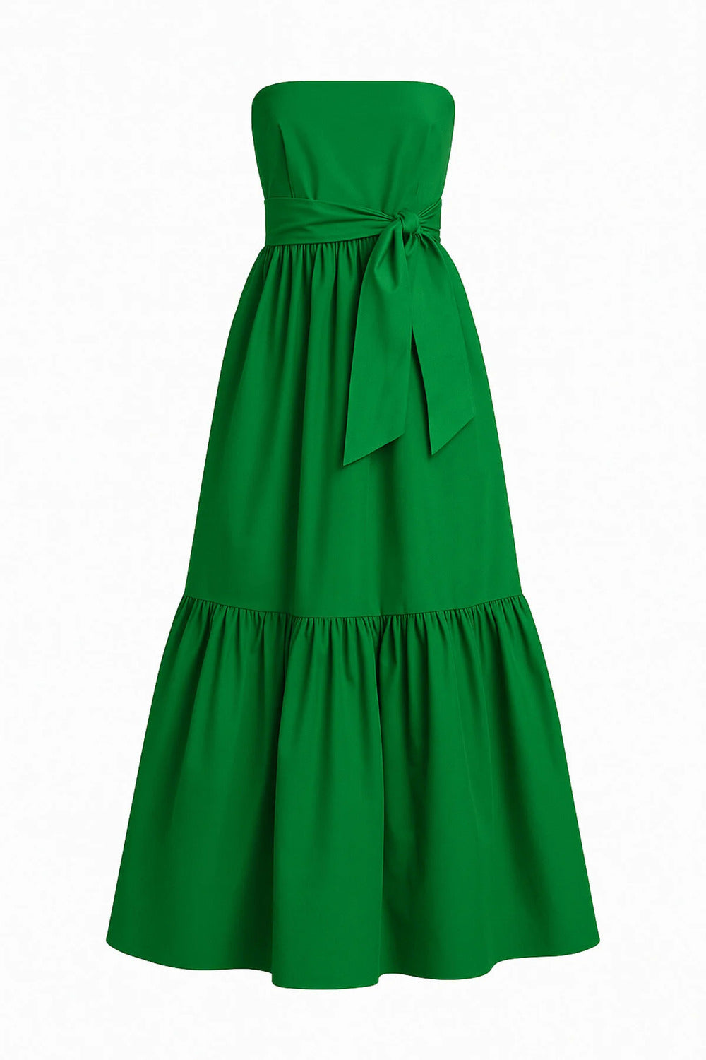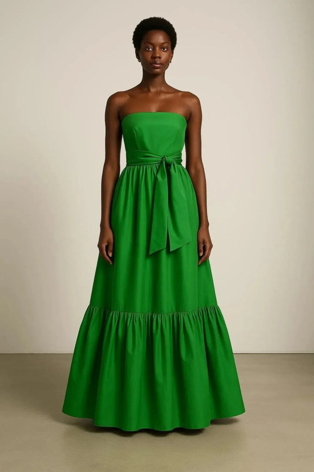 Etek Ucu Fırfır Detaylı & Kuşaklı Maxi Boy Yeşil Tafta Straplez Elbise