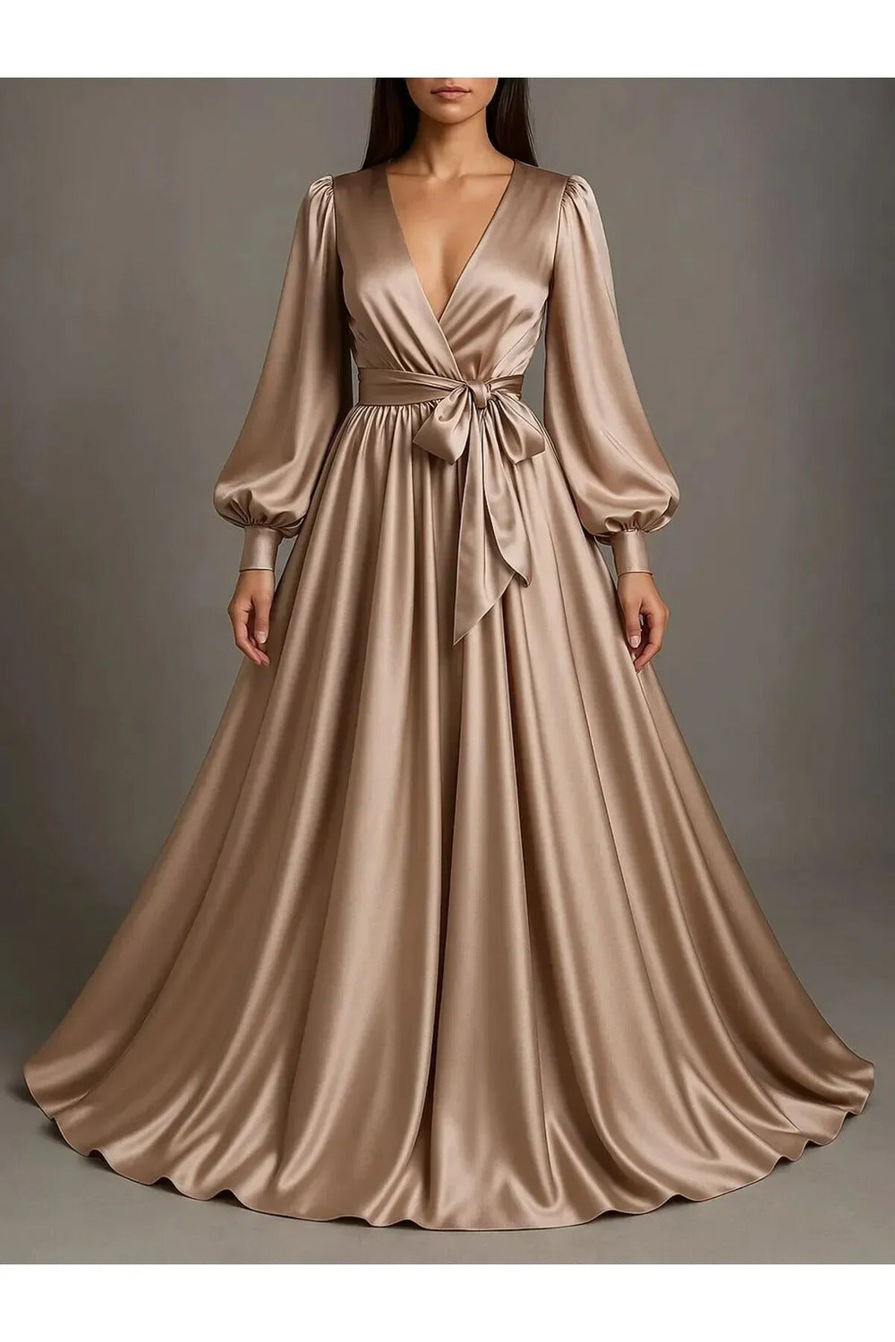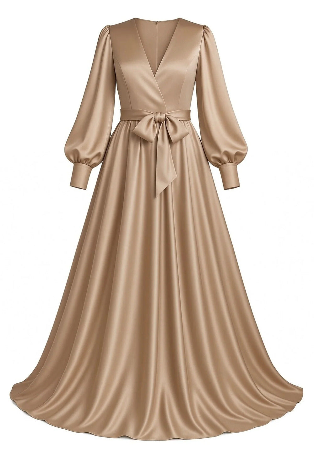 Kuşaklı, Kruvaze Kapamalı & Balon Kollu Bej Saten Maxi Şık Elbise