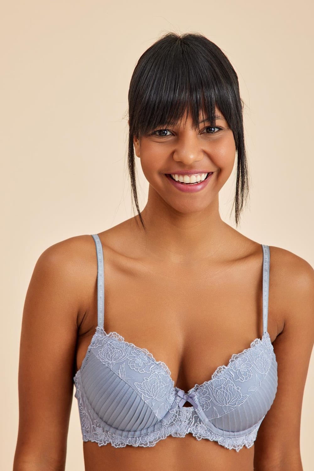 Paris Gri Mavi Balenli Dantelli Dolgulu Push-Up Sütyen