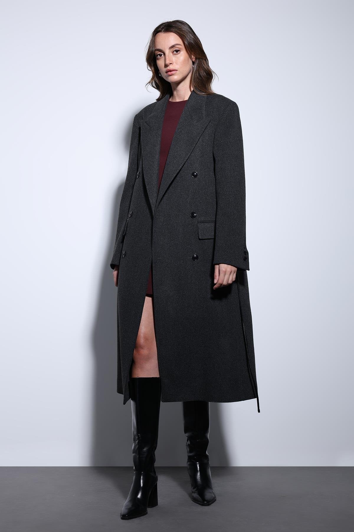 Antrasit Kemerli Kruvaze Kadın Kaban