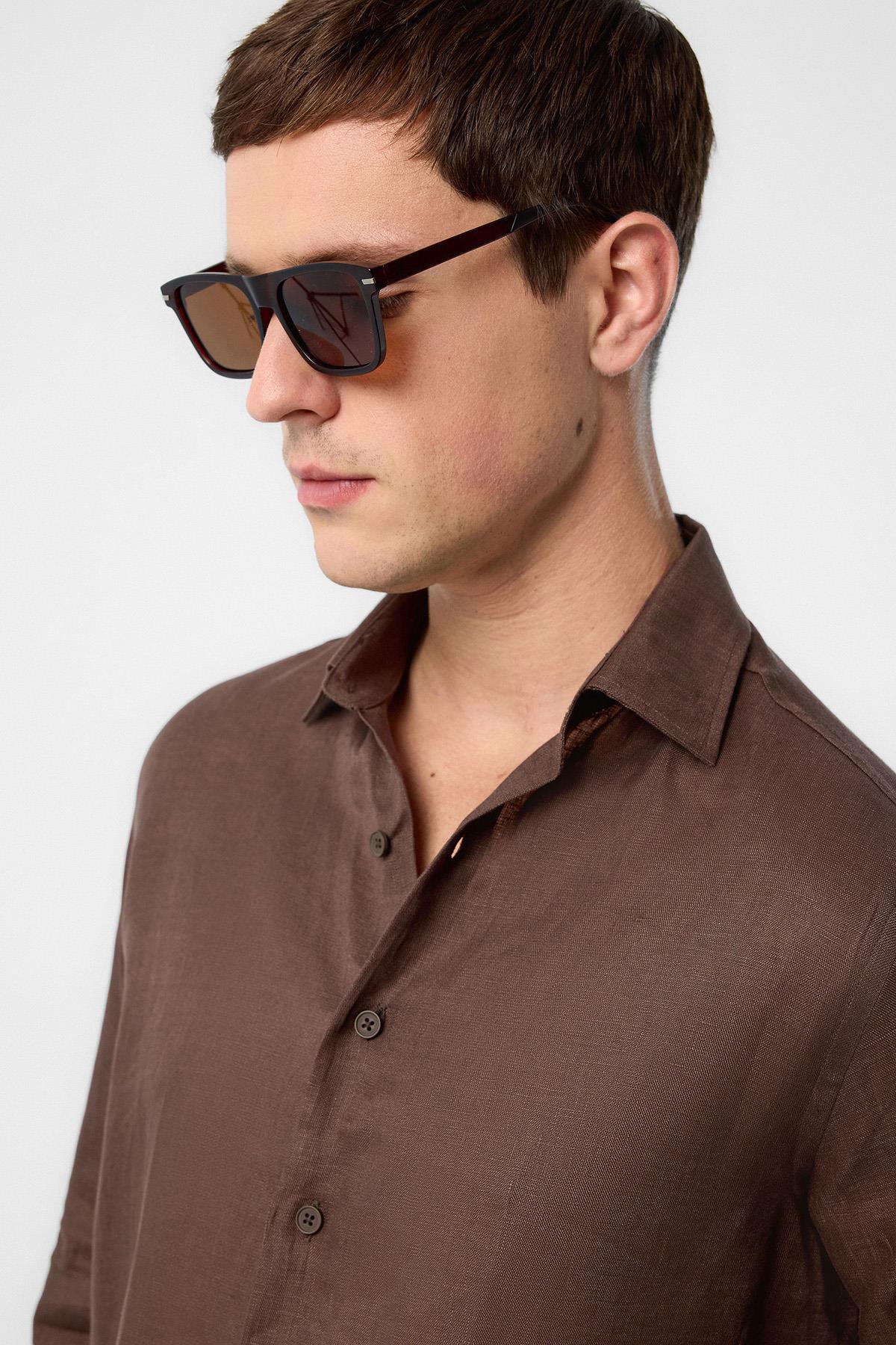 Kahve 100% Keten Comfort Fit Erkek Gömlek