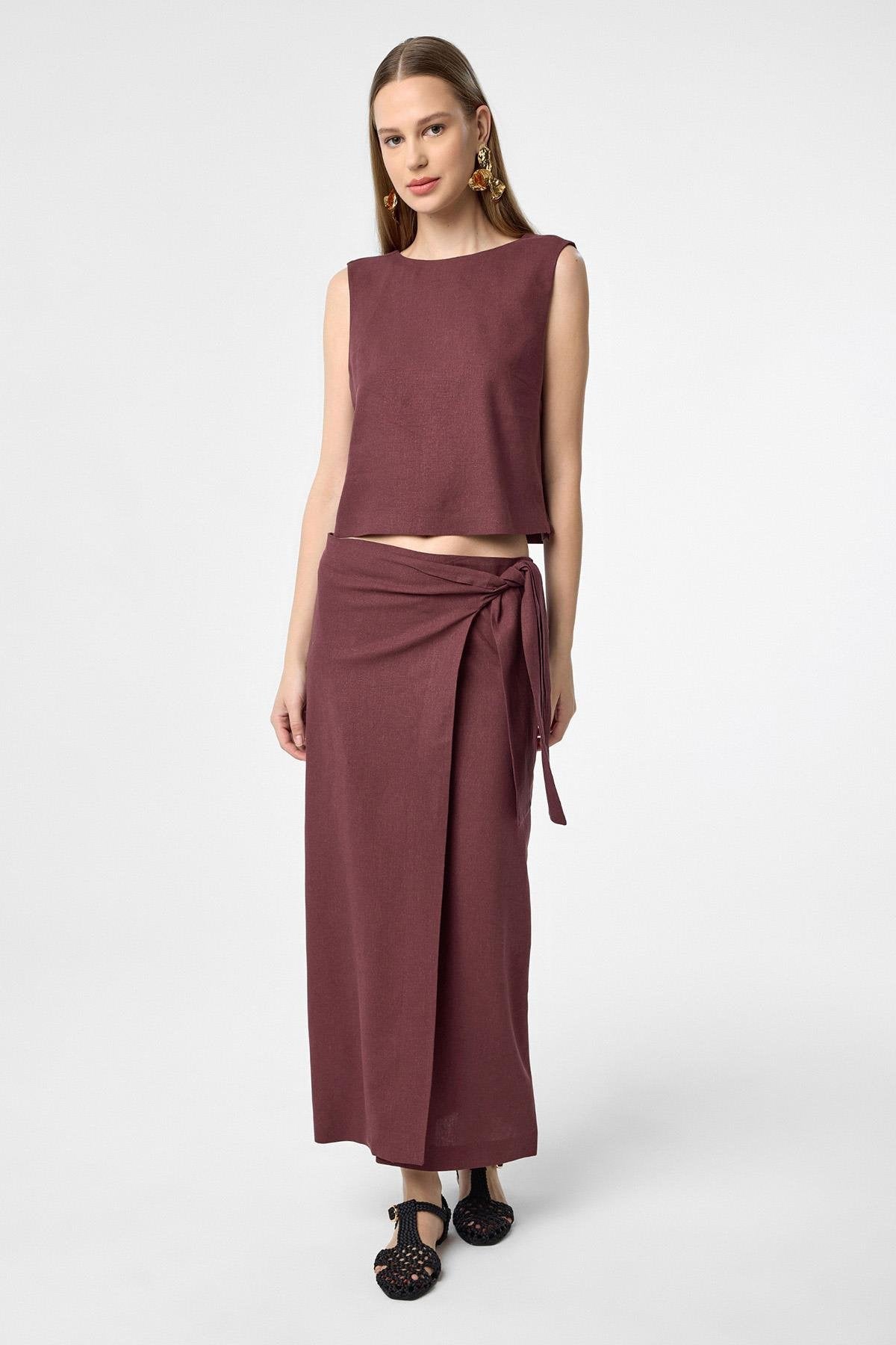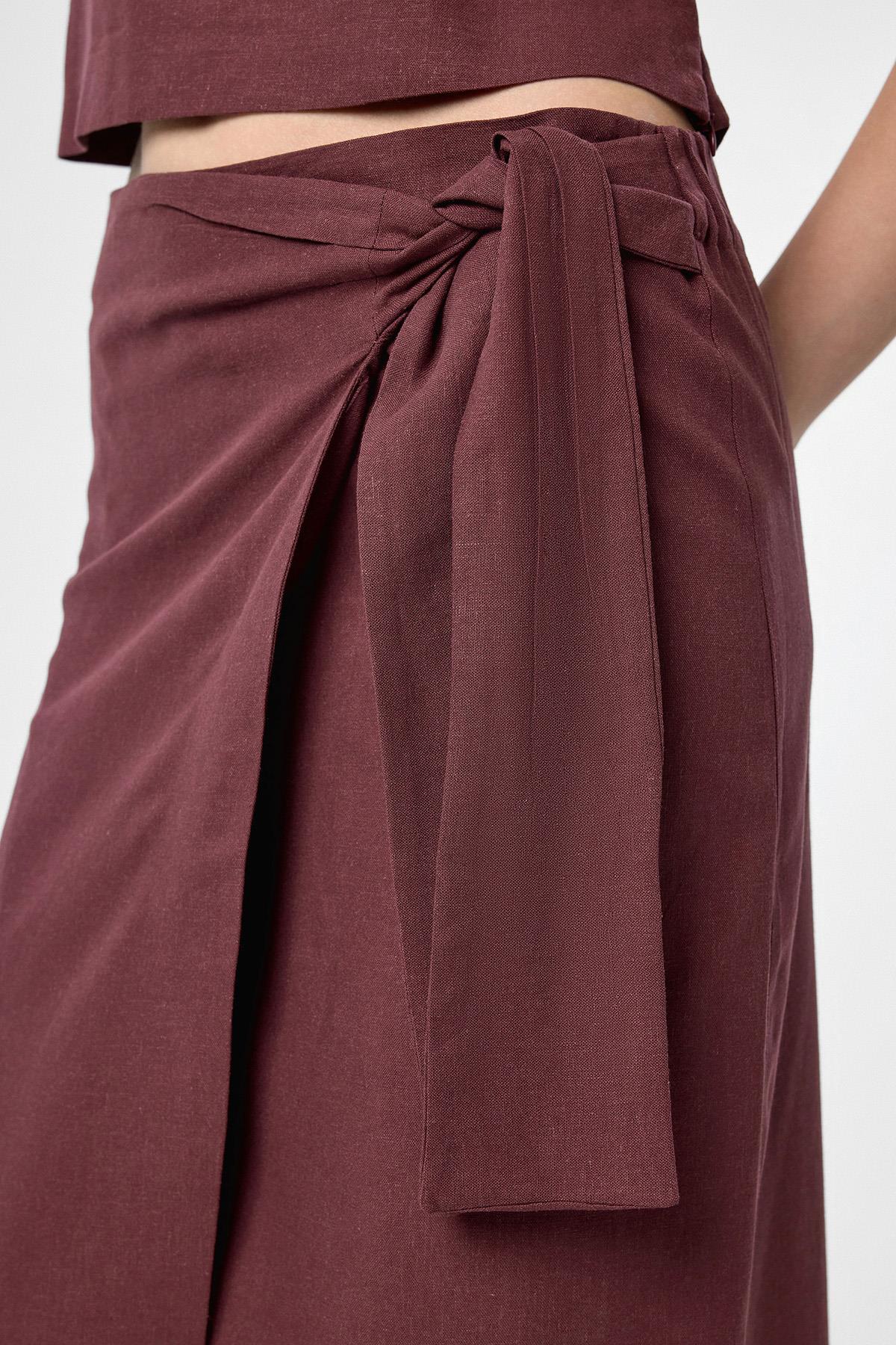 Bordo Keten Karışımlı Kuşaklı Kadın Etek