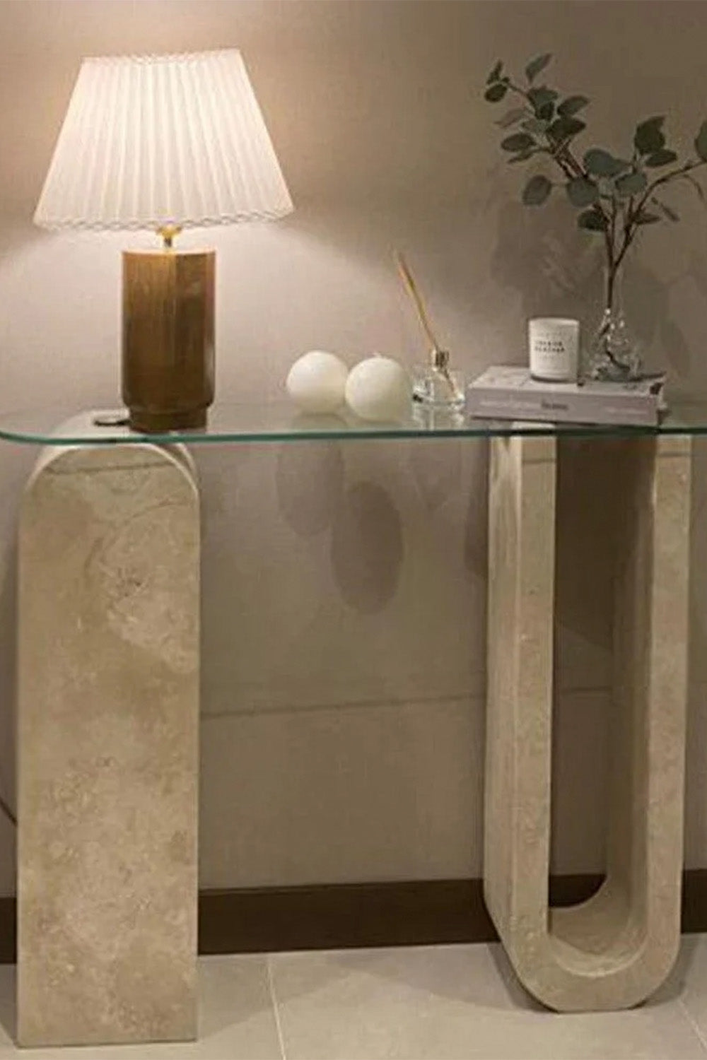Petra Dresuarda, traverten üzeri cam bir tabla kullandık.