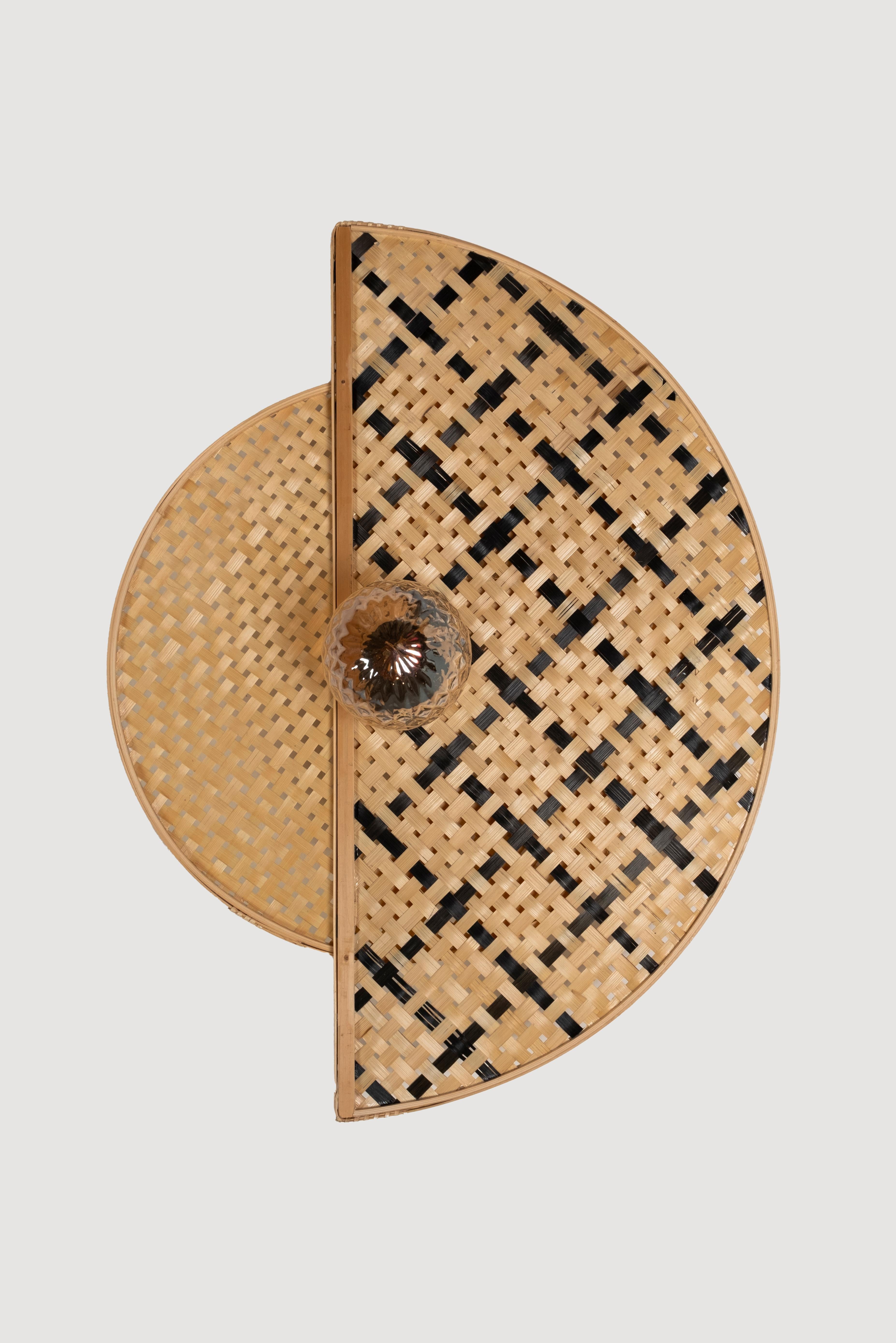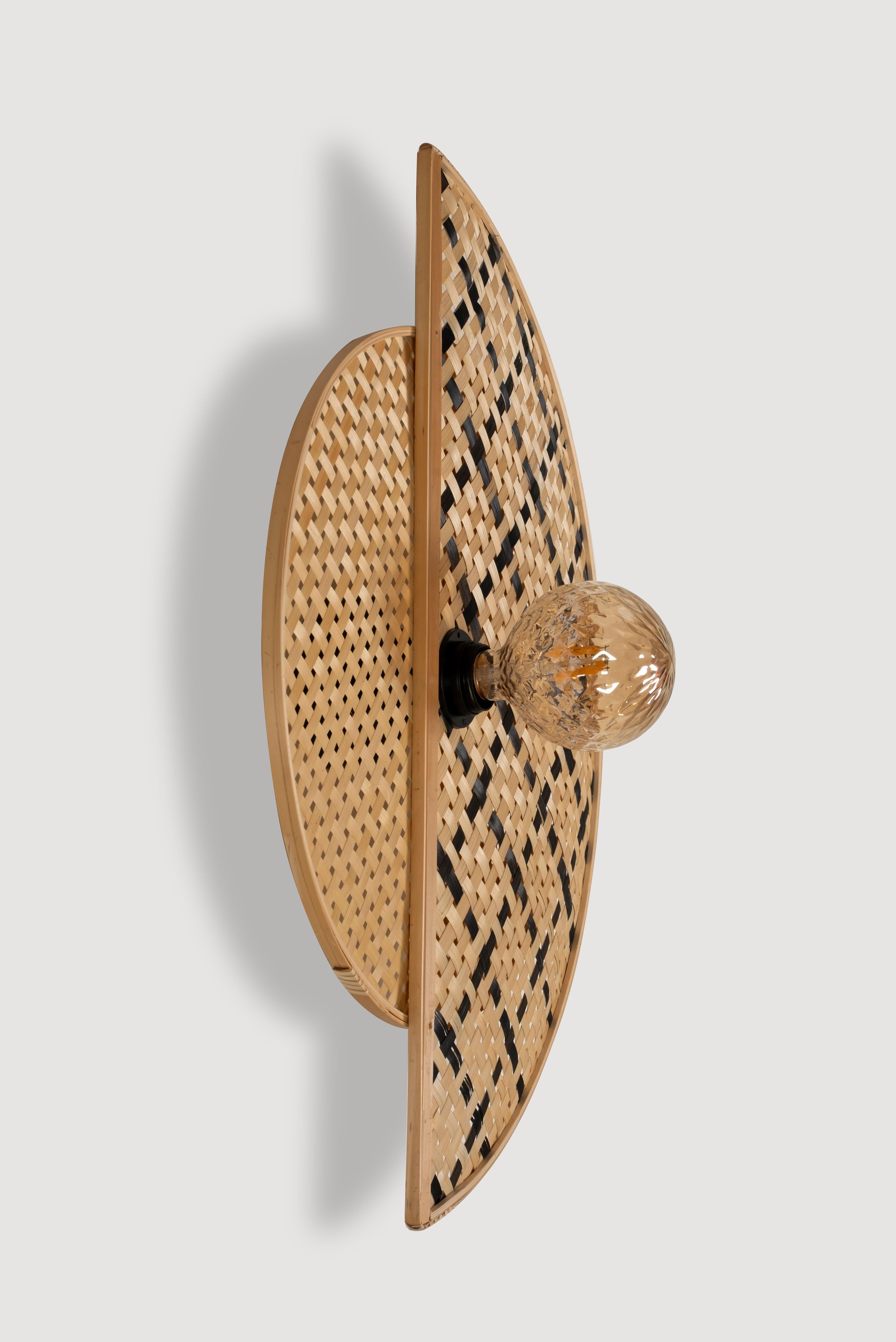 Şık ve modern bir duvar aplik tasarımı yer almaktadır. Doğal dokularla işlenmiş, hasır tarzı bir yüzeye sahip olan bu aplik, iç mekân dekorasyonunda sıcak ve otantik bir atmosfer yaratmayı hedefler. Hem estetik hem de işlevsel olan bu aydınlatma ünitesi, doğal materyaller ve sade çizgileriyle dikkat çeker. Rustik ve bohem tarzlarla uyum sağlayacak şekilde tasarlanmış bu aplik, yatak odası, oturma odası veya koridor gibi alanlara sıcak bir dokunuş katmak için idealdir.