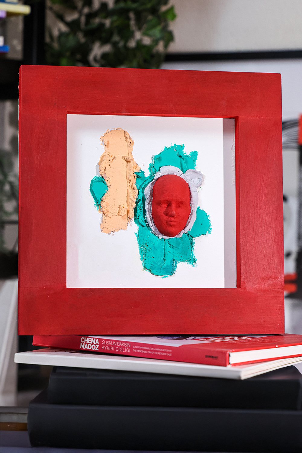 Tamamen el yapımı özgün bir eseridir. Çerçeve ahşap olup içindeki doku ve mask beton kullanılarak üretilmiştir. Sanat eseri olduğu için imzalı bir orijinallik sertifikası ile gönderilecektir. Ev ya da ofis dekorasyonu amacı ile de kullanılabilir.