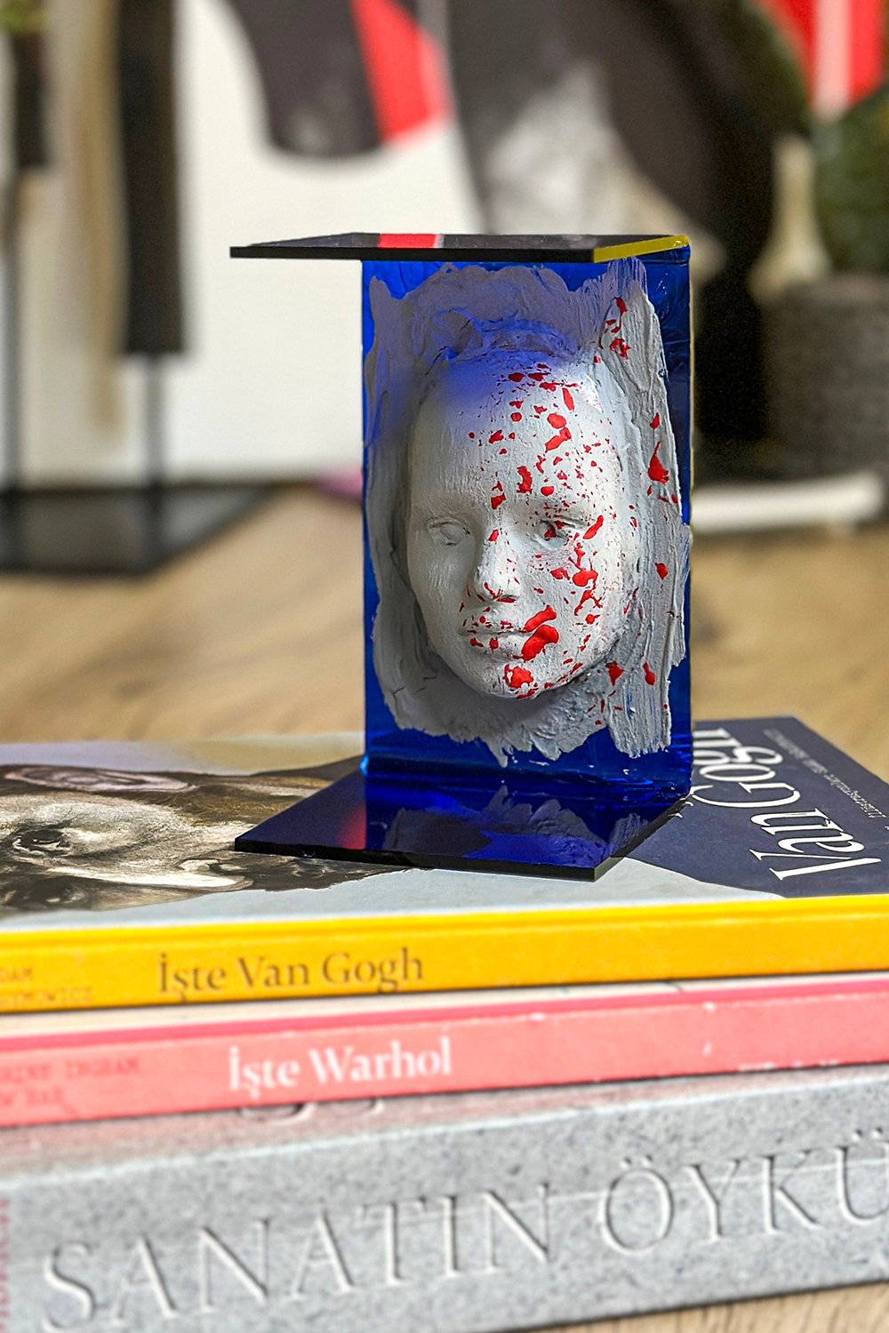 Tamamen el yapımı özgün bir eseridir. Mavi zemin akrilik olup mask beton kullanılarak üretilmiştir. Sanat eseri olduğu için imzalı bir orijinallik sertifikası ile gönderilecektir. Ev ya da ofis dekorasyonu amacı ile de kullanılabilir.