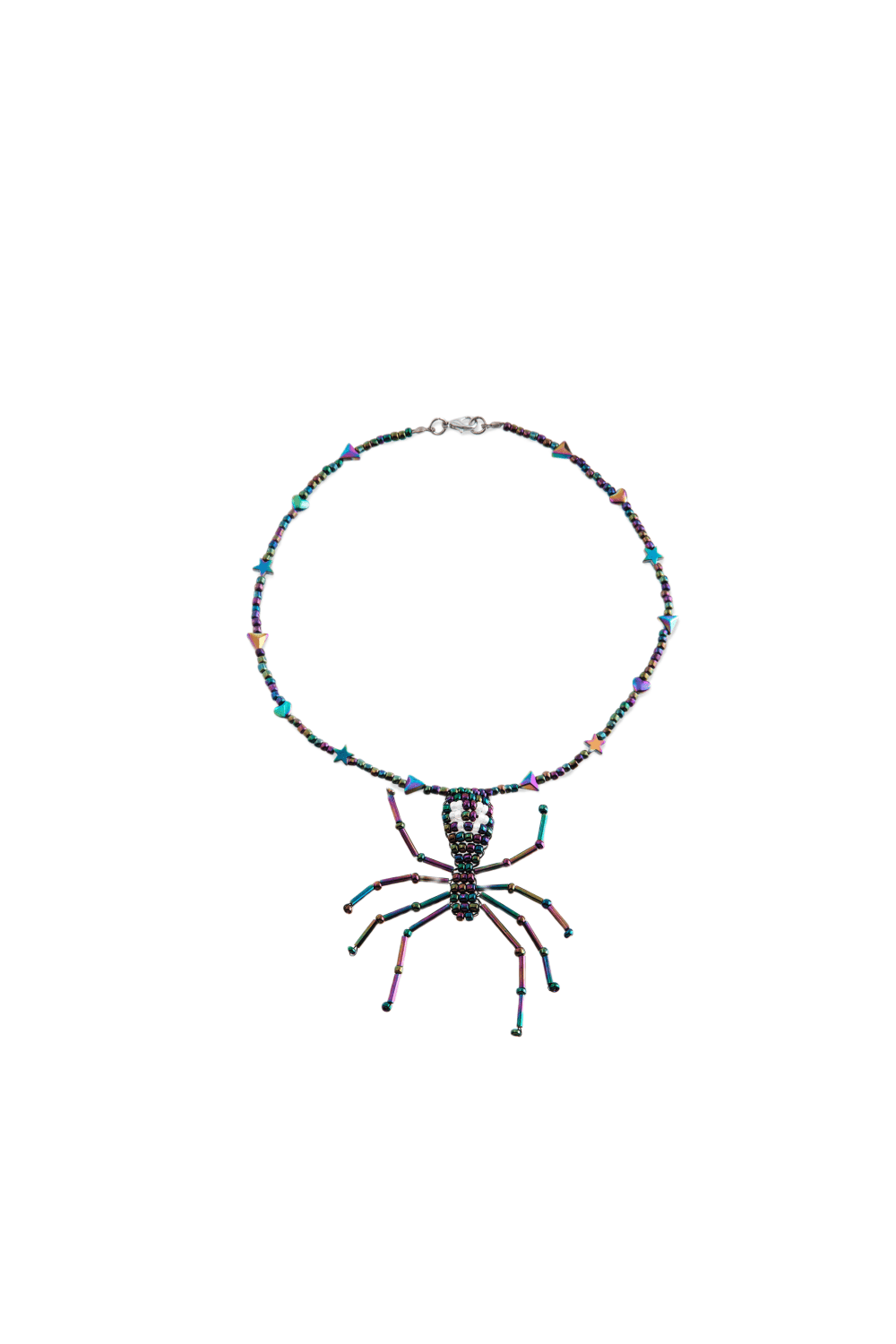 Necklace with a reptiloid figure woven with sand beads, decorated with hematite natural stones, with a tarnish-free steel intermediate material.