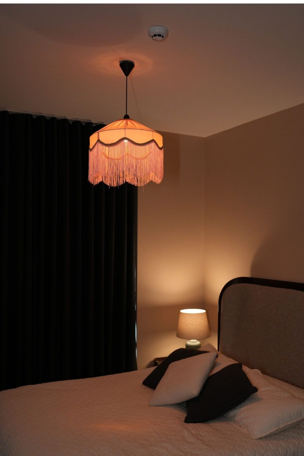 Cotton Candy Sarkıt Avize, adını andıran tatlılıkta bir estetik sunuyor. Pastel pembe tonlarındaki saten kumaşı, altın geçişli zarif püsküllerle birleşerek, özellikle yatak odaları ve butik mekanlar için eşsiz bir ambiyans oluşturur. Loş ışıkta narin bir parıltıyla ortama romantik ve davetkar bir hava katar.45 cm çapındaki formu, hem odak noktası olacak kadar iddialı hem de dekorun doğal bir parçası olacak kadar yalın.