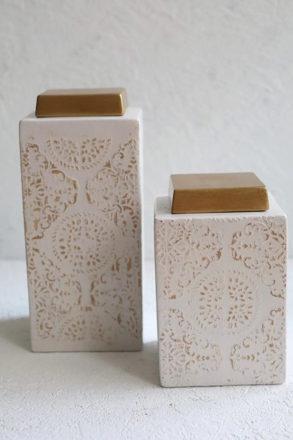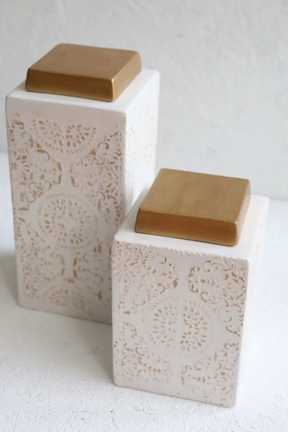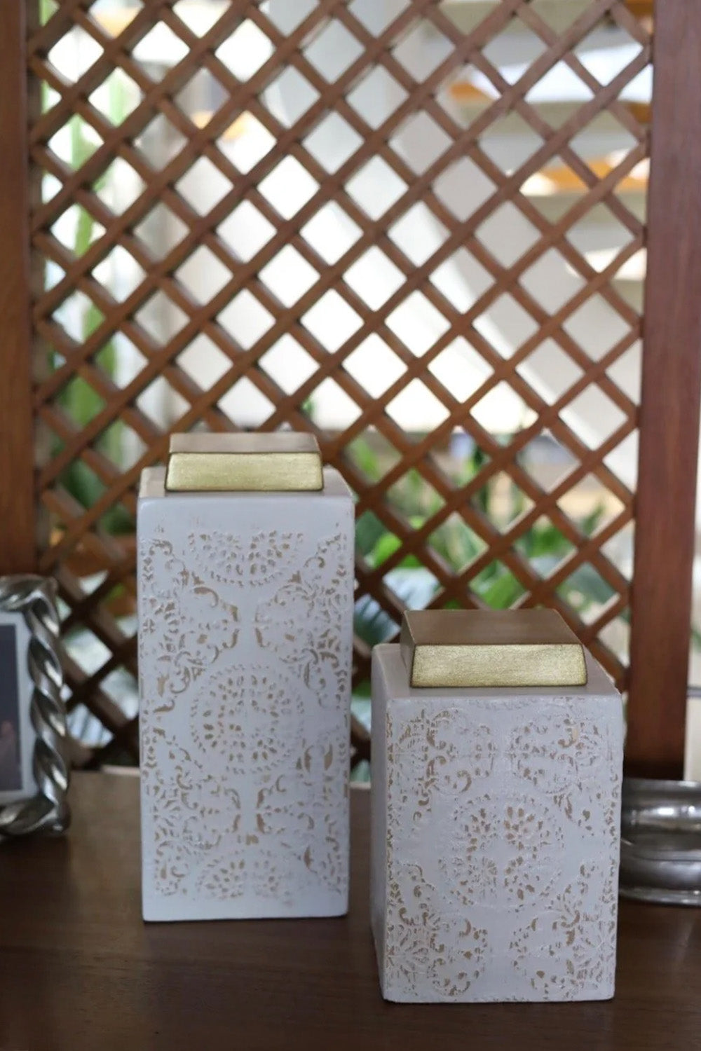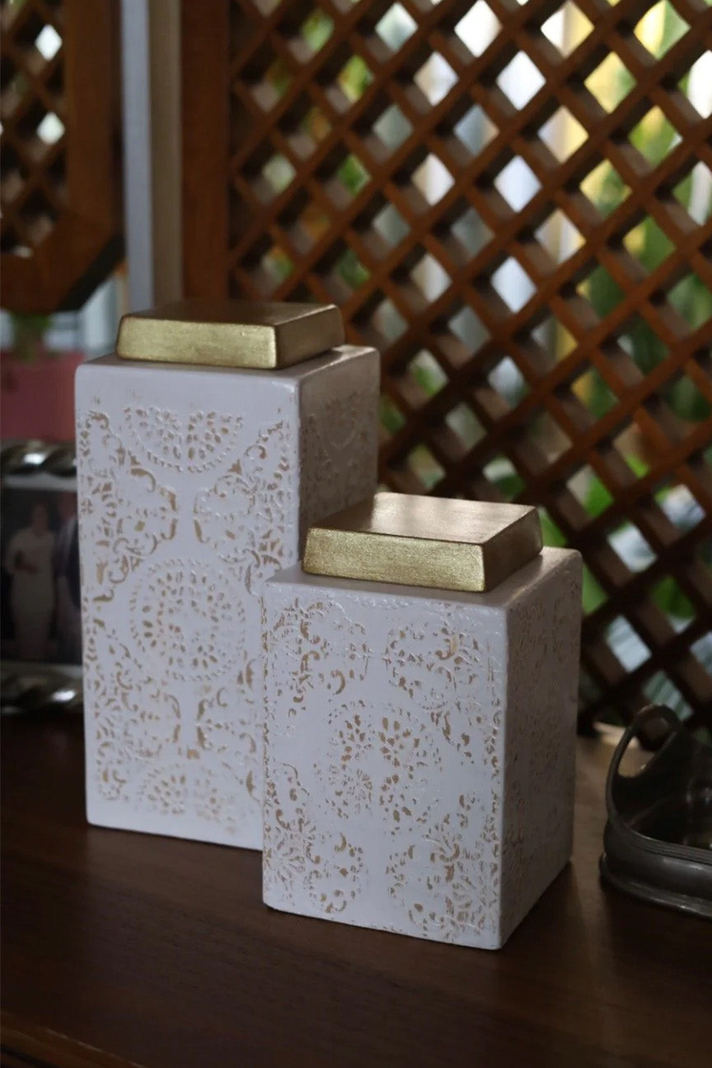 Krem ve toprak tonlarıyla gövde çalışması yapılan vazolarda, kapak antik altın rengiyle zenginleştirilmiş tasarımcımızın elinde...