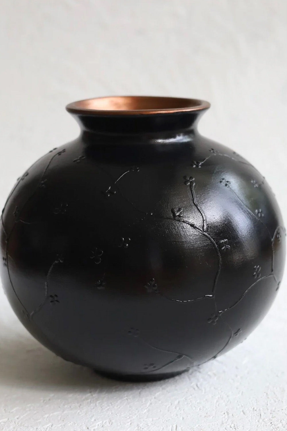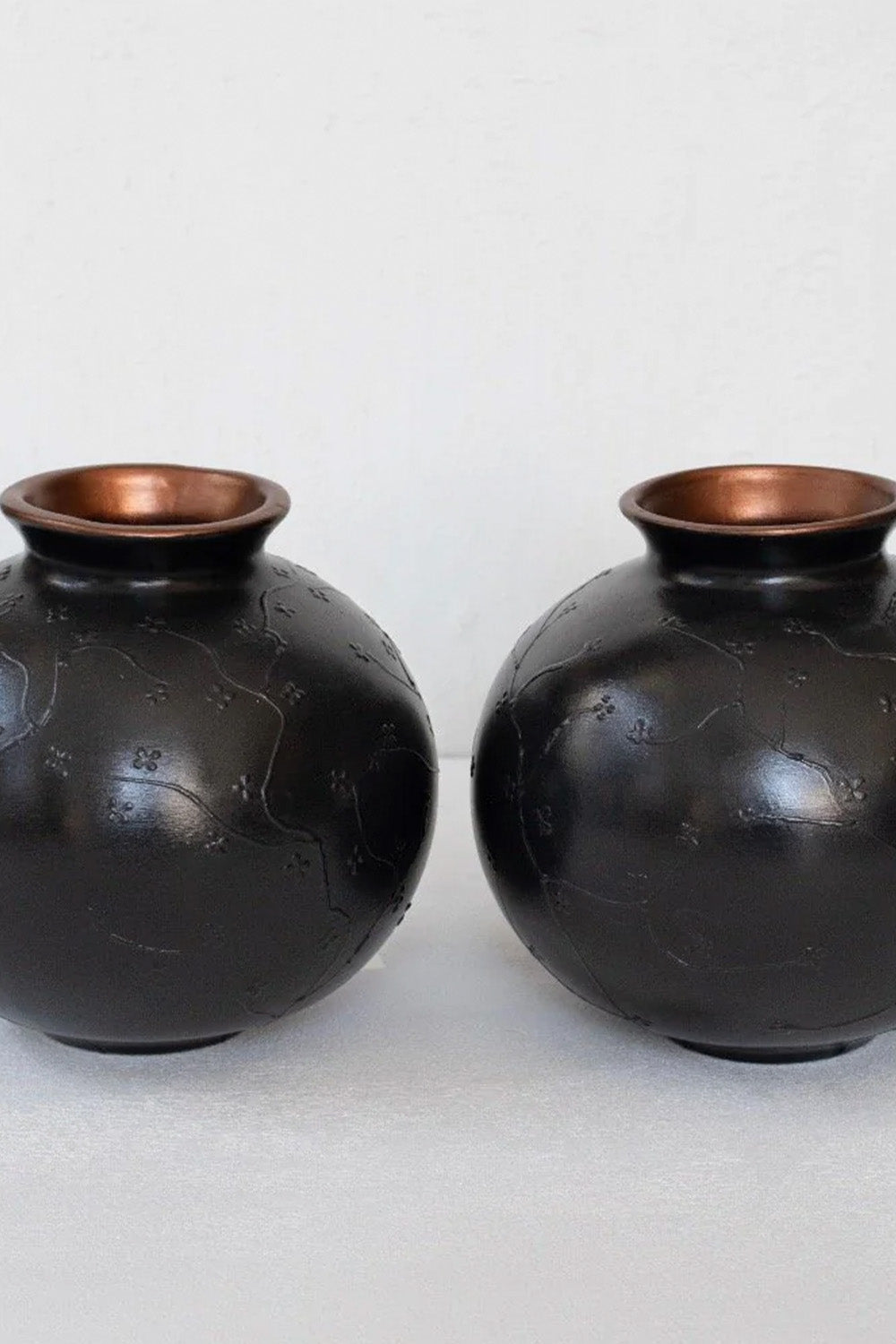 Venüs simgesi ile ilişkilendirilen bu özel vazo seti, el işçiliği ve özgün tasarımı ile dikkat çekiyor. Siyah ana gövde üzerinde bakır vazo ağızları, zarif bir kontrast oluşturarak