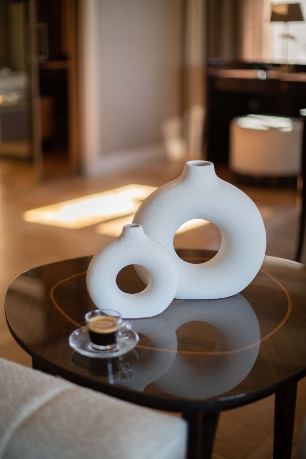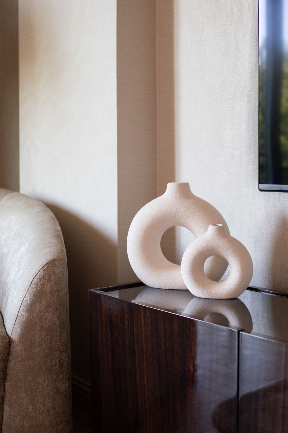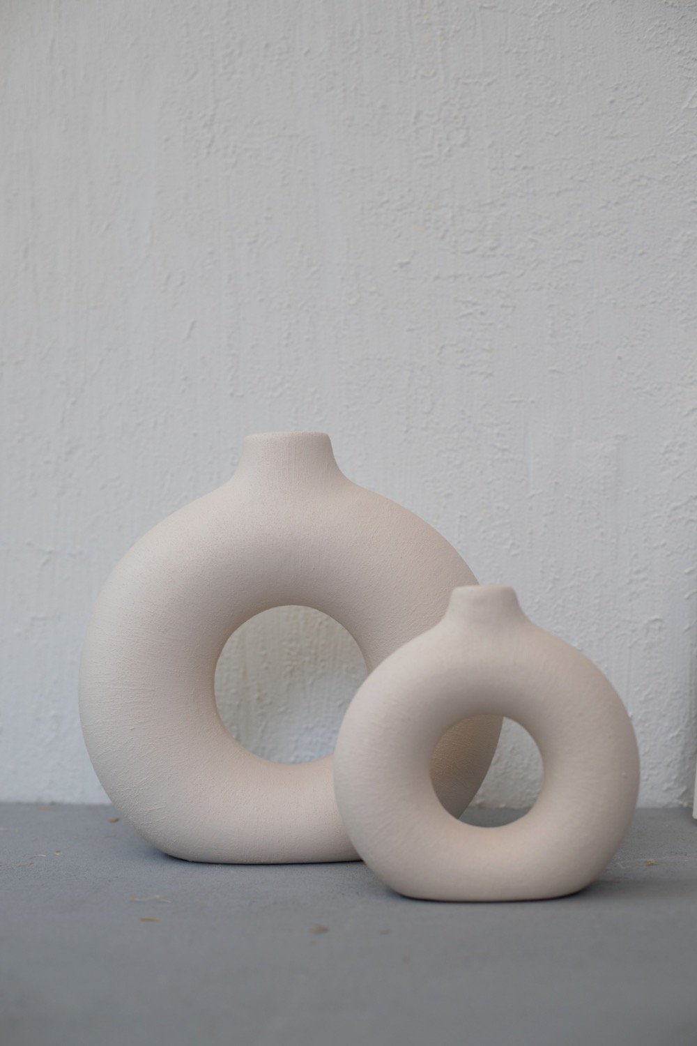 Evinizin dekorasyonuna zarif bir dokunuş katmak için tasarlanmış bu şık ikili krem rengi dokulu halka vazo seti, ünlü tasarımcımız Derya Kurdoğlu tarafından özenle hazırlanmıştır. Nordic serisinin devamı olan bu eşsiz vazo seti, iki farklı boyutta sunulmaktadır.
