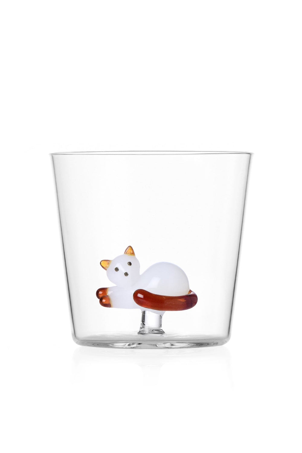 Tabby Cat koleksiyonunun bu sevimli parçası, amber renkli kuyruğu ile dikkat çeken yatan beyaz kedi figürüyle fark yaratıyor. Bardak tabanına yerleştirilen detaylı cam figür, içeceğinizi her yudumladığınızda gülümseten bir sürpriz sunar. Borosilikat camdan üretilen bu su bardağı, hem hafif hem de dayanıklıdır. Evinde eğlenceli detaylar sevenler ya da kedi tutkunları için ideal bir tasarım objesidir. Günlük kullanımda olduğu kadar hediye seçeneği olarak da öne çıkar.