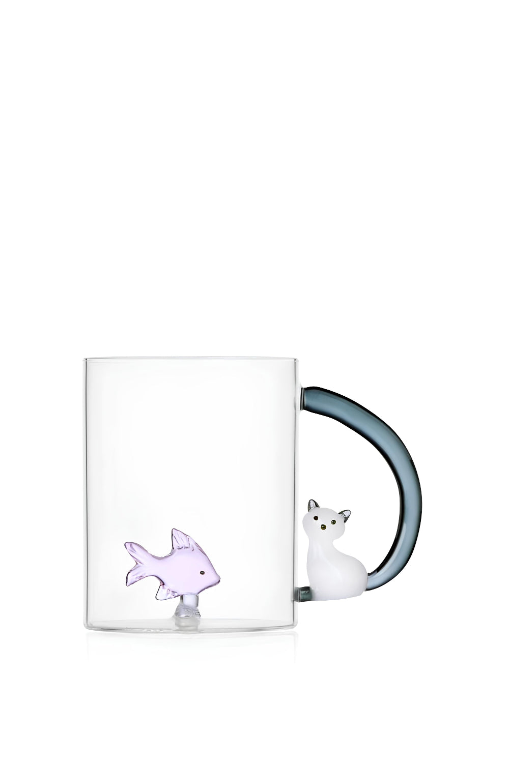 Tabby cat koleksiyonundan balık ve kedi figürlü cam kupa.