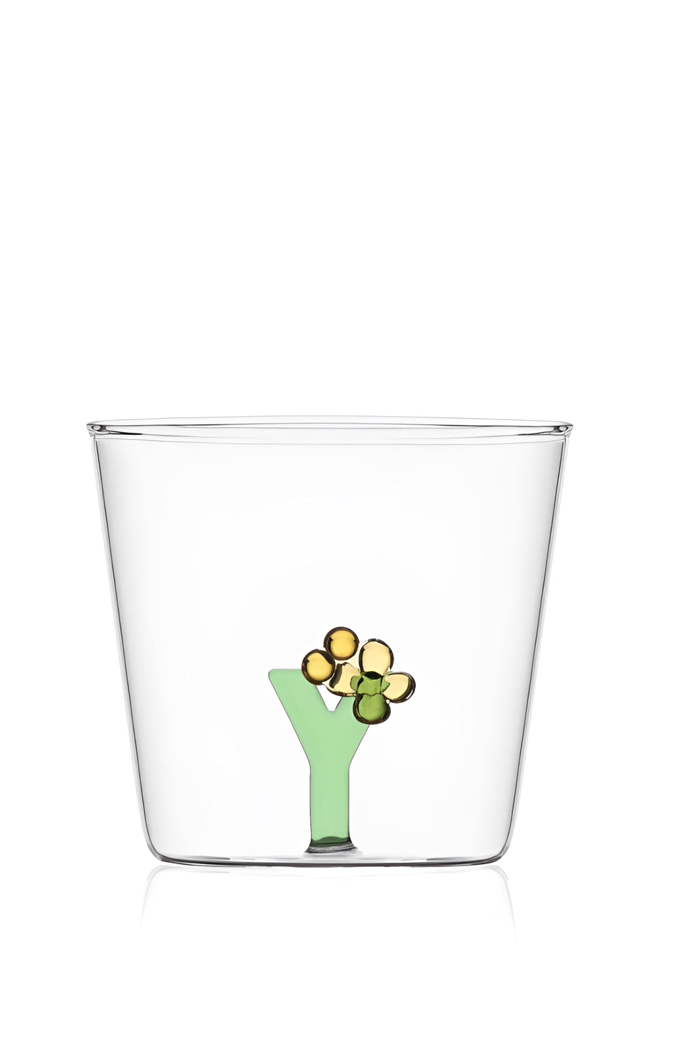 Bloom Alphabet koleksiyonundan yeşil renkli Y harf figürlü cam su bardağı.
