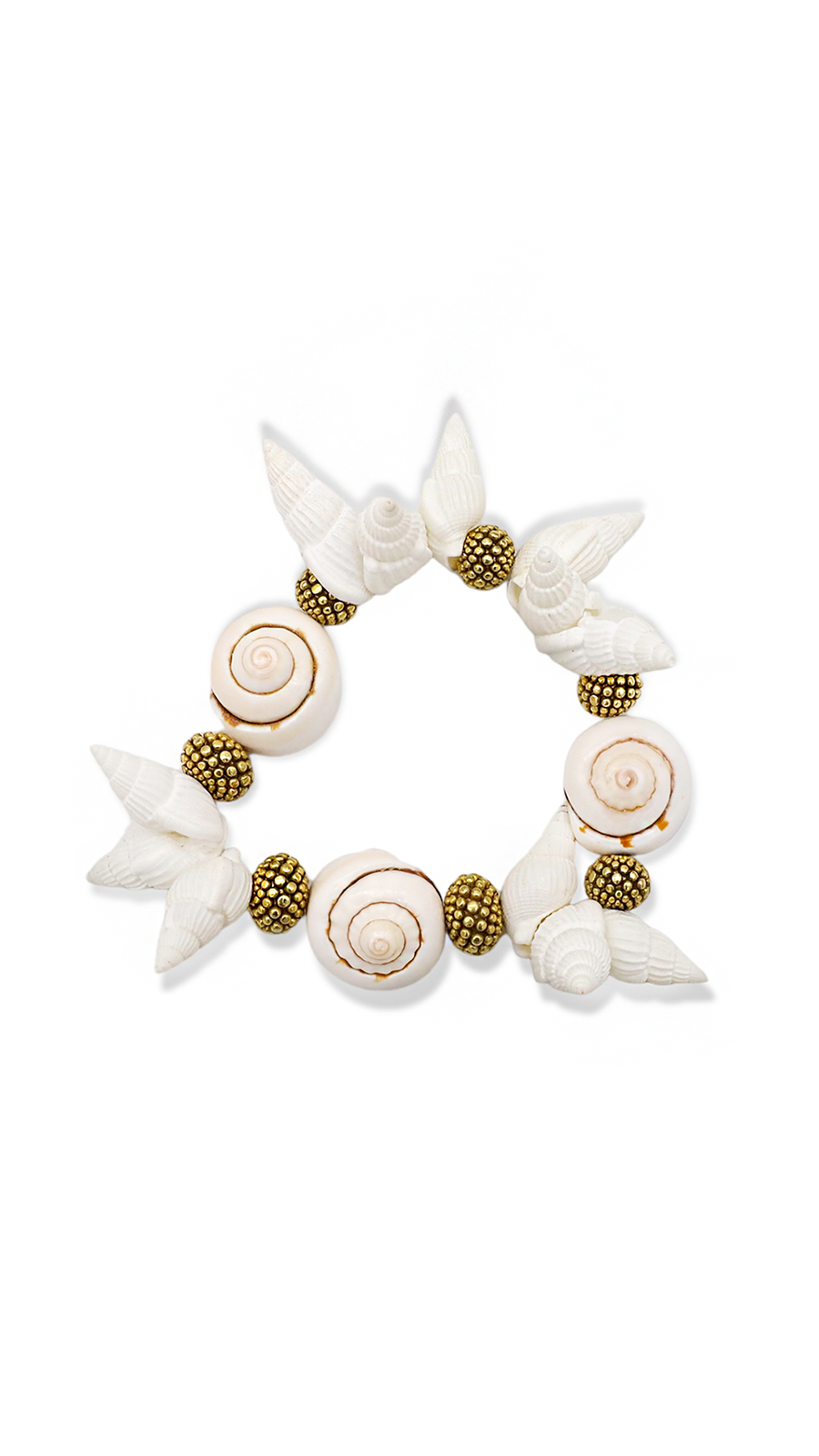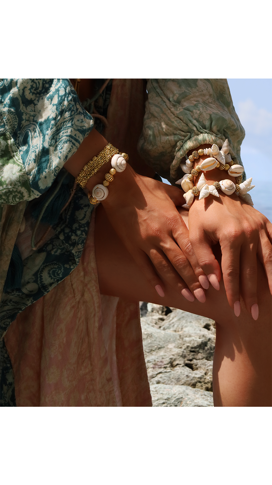 FERIADO Doğal Taş Bileklik, denizin büyüleyici güzelliklerini bileğinize taşır. Bayemeyc atölyesinde özenle tasarlanan bu bileklik, denizden gelen doğal kabuklar ve 22 ayar altın kaplama eskitme altın materyallerle oluşturulmuştur. Güverse formundaki tasarımıyla benzersiz bir şıklık sunar.