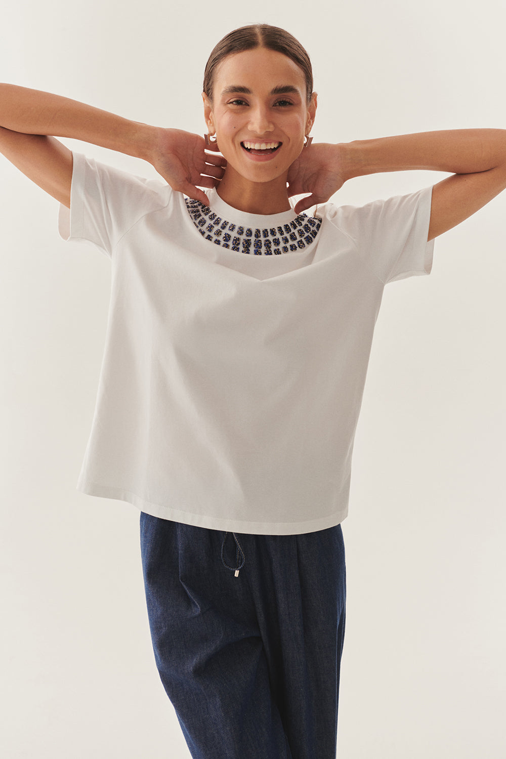 Zarif işleme detaylarıyla hareketlendirilmiş, sade ve şık bir tasarıma sahip bu t-shirt, klasik bisiklet yaka formuyla günlük şıklığı tamamlıyor. Regular kesimi sayesinde konforlu bir kullanım sunarken, yakasındaki göz alıcı işlemeler modern ve zarif bir görünüm katıyor.