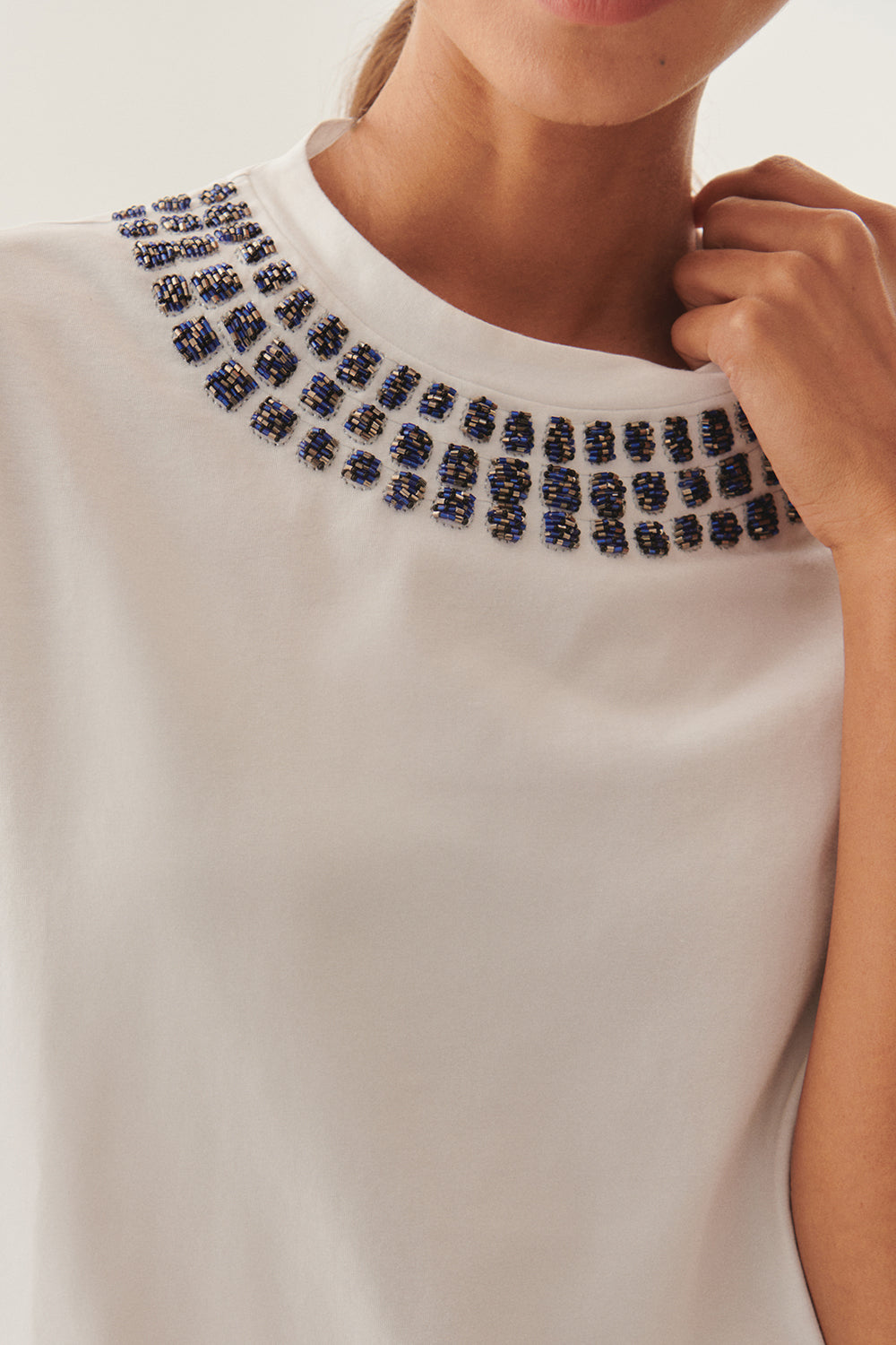 Yakası İŞleme Detaylı Bisiklet Yaka Beyaz Regular Pamuklu Örme Tişört