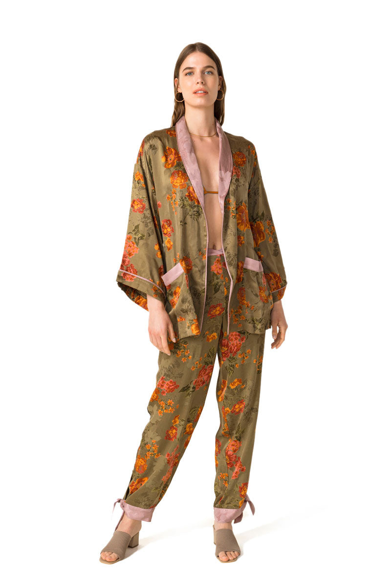 Yeşil renk üzeri jakar çiçek desenlidir. Bel, cepler ve paça jakarlı pembe kumaş ile garnilenmiştir.