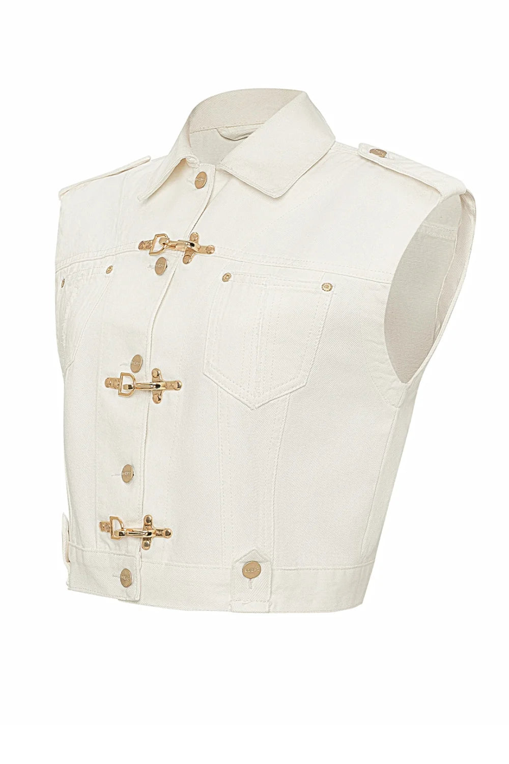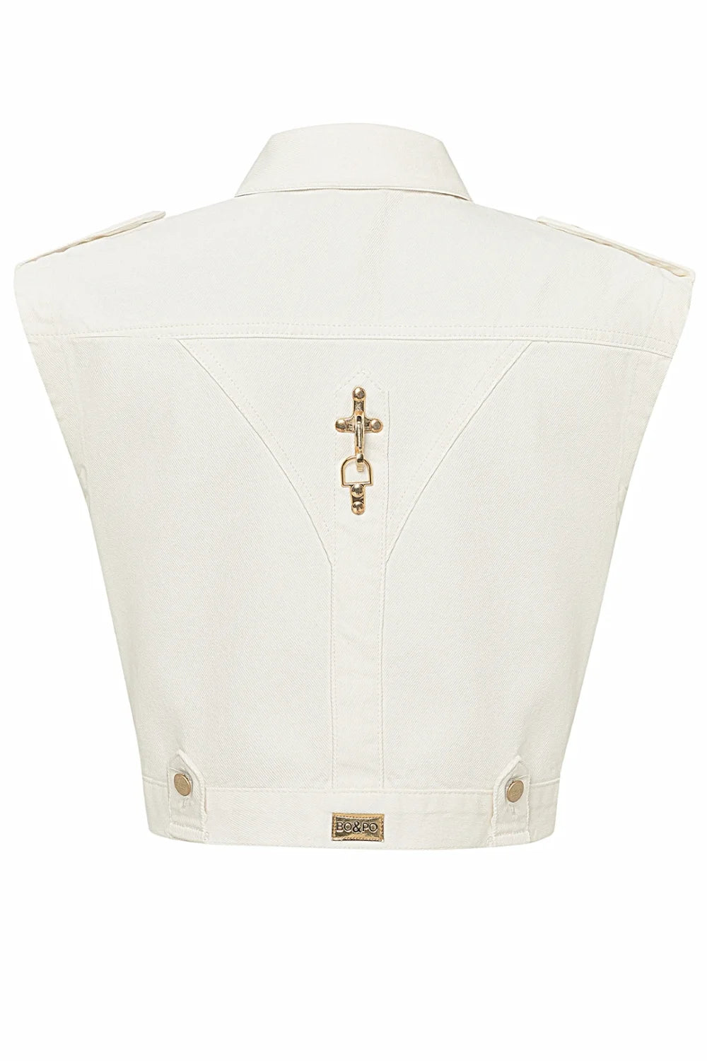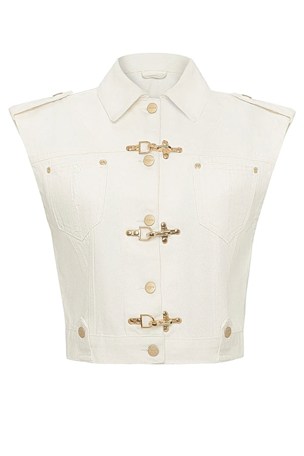 Günlük ve özel kombinlerinizi tamamlayacak gold aksesuar detaylı şık denim yelek, feminen ve modern tasarımıyla öne çıkar. %100 pamuk (cotton) kumaşı sayesinde nefes alabilen, rahat ve dayanıklı bir kullanım sunar. Cream rengi, farklı stil seçenekleriyle kolayca uyum sağlar.