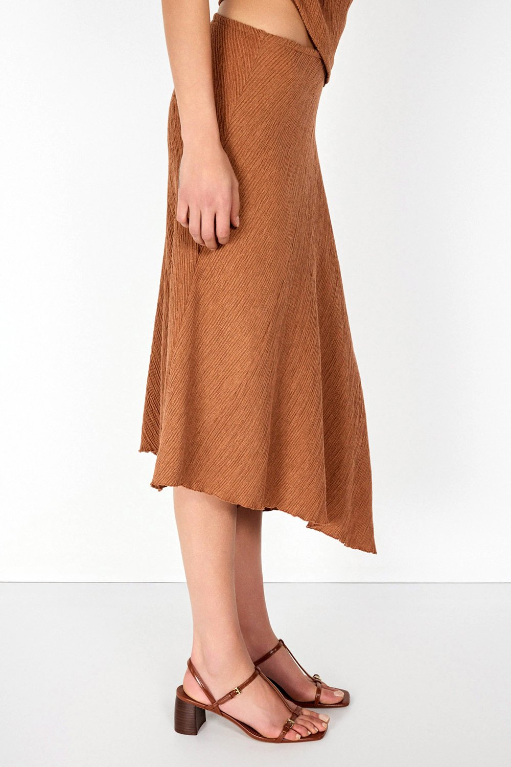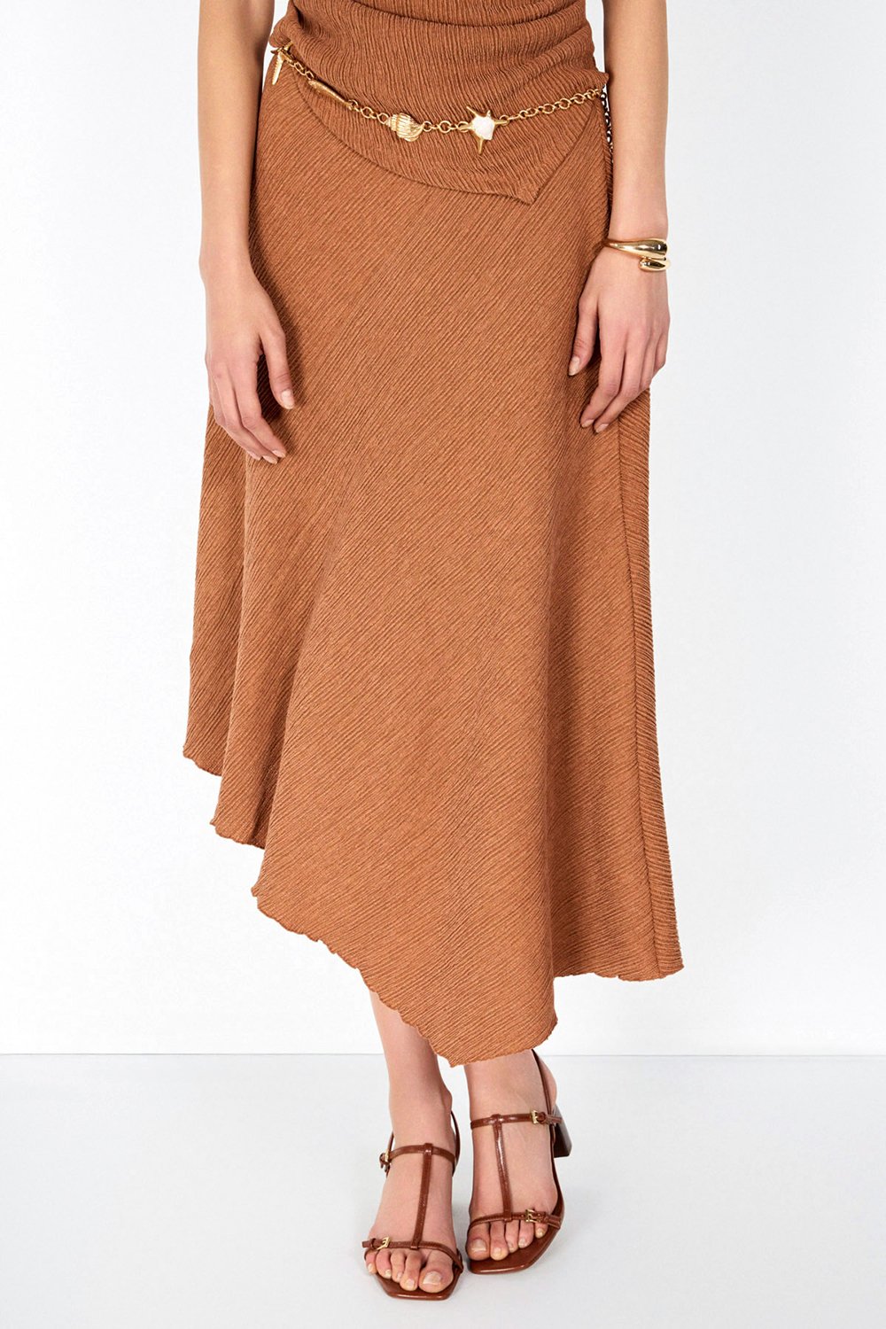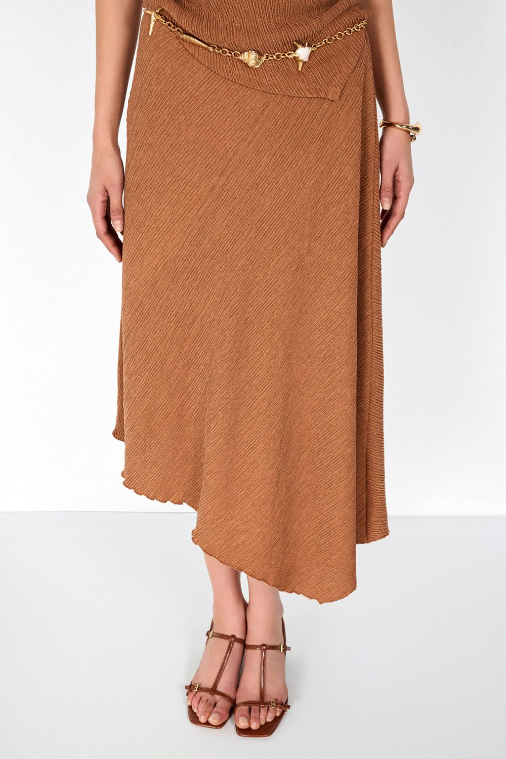 Tarçın ve mint yeşili tonlarındaki etek görünümü boyutlandıran bürümcük kumaş dokusu ve asimetrik tasarımı ile günlük, spor şık ve özel buluşmalar için geniş bir kullanım yelpazesi sunuyor.