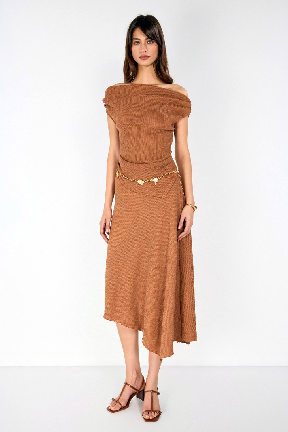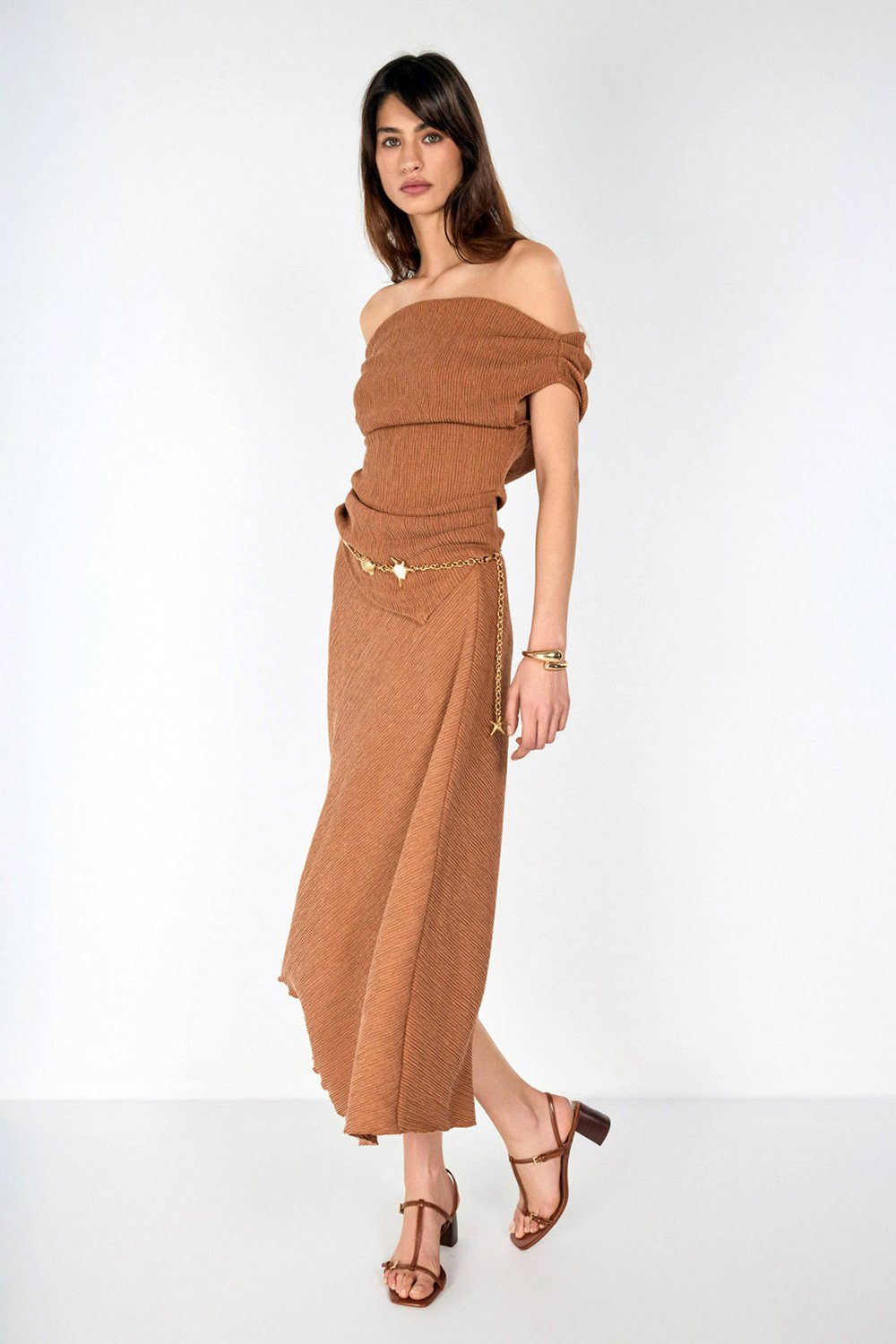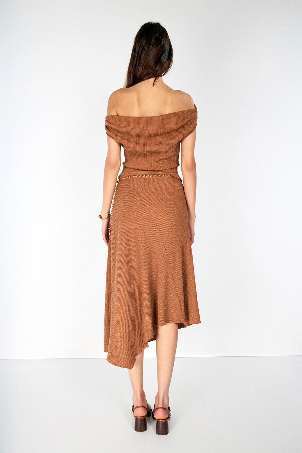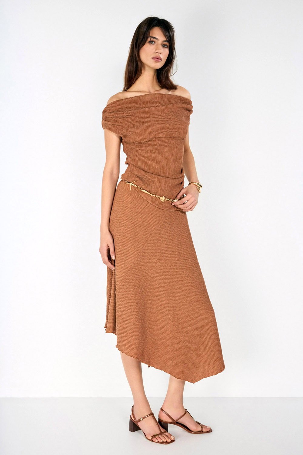 Tarçın ve mint yeşili tonlarındaki etek görünümü boyutlandıran bürümcük kumaş dokusu ve asimetrik tasarımı ile günlük, spor şık ve özel buluşmalar için geniş bir kullanım yelpazesi sunuyor.