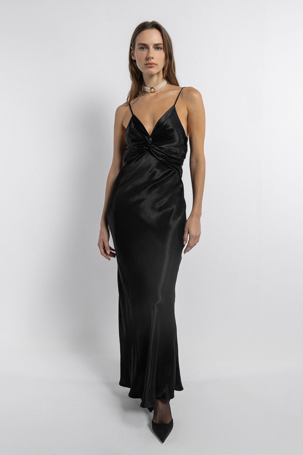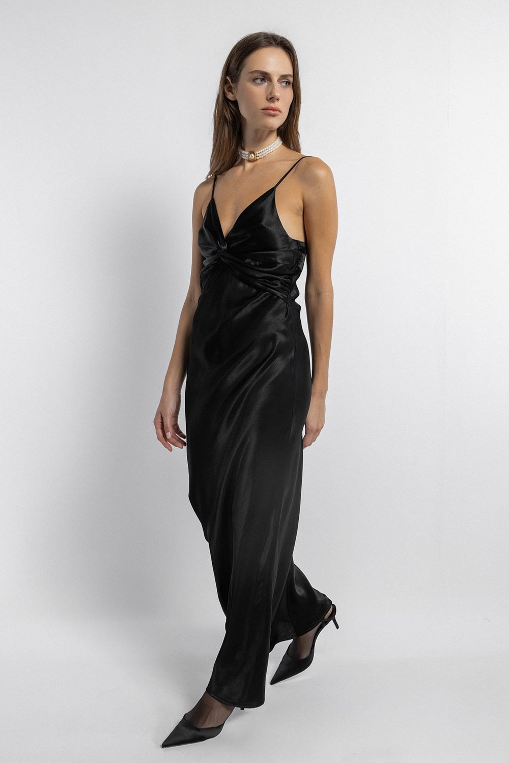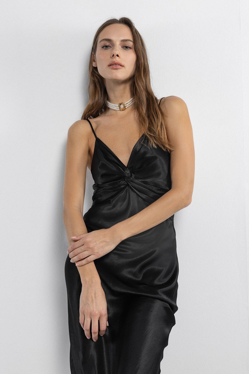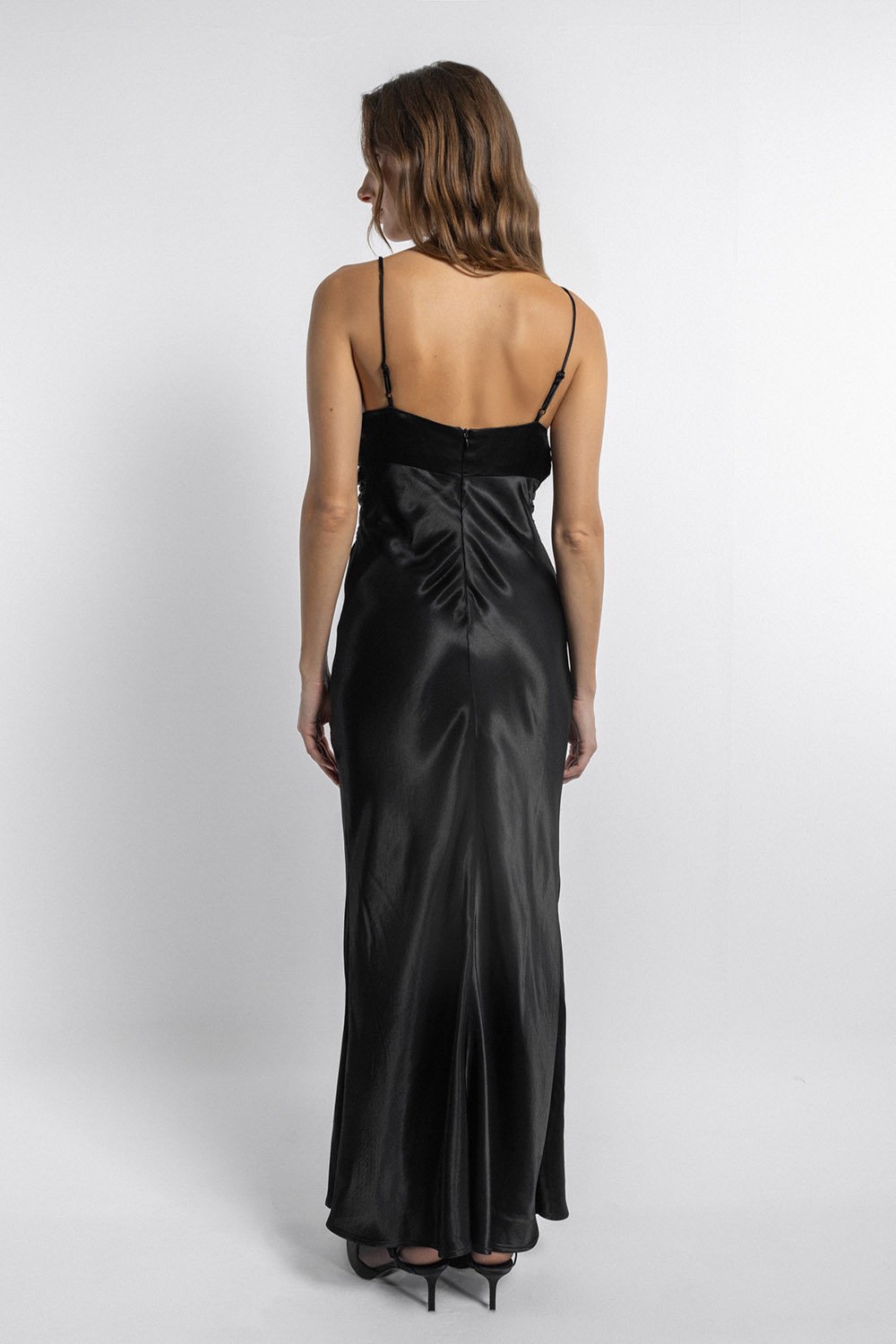Vücuda oturan silüeti ile yarım sırt dekoltesi ince askılı bu gece elbiseni cüretkar ve zarif bir görünümde buluşturuyor.