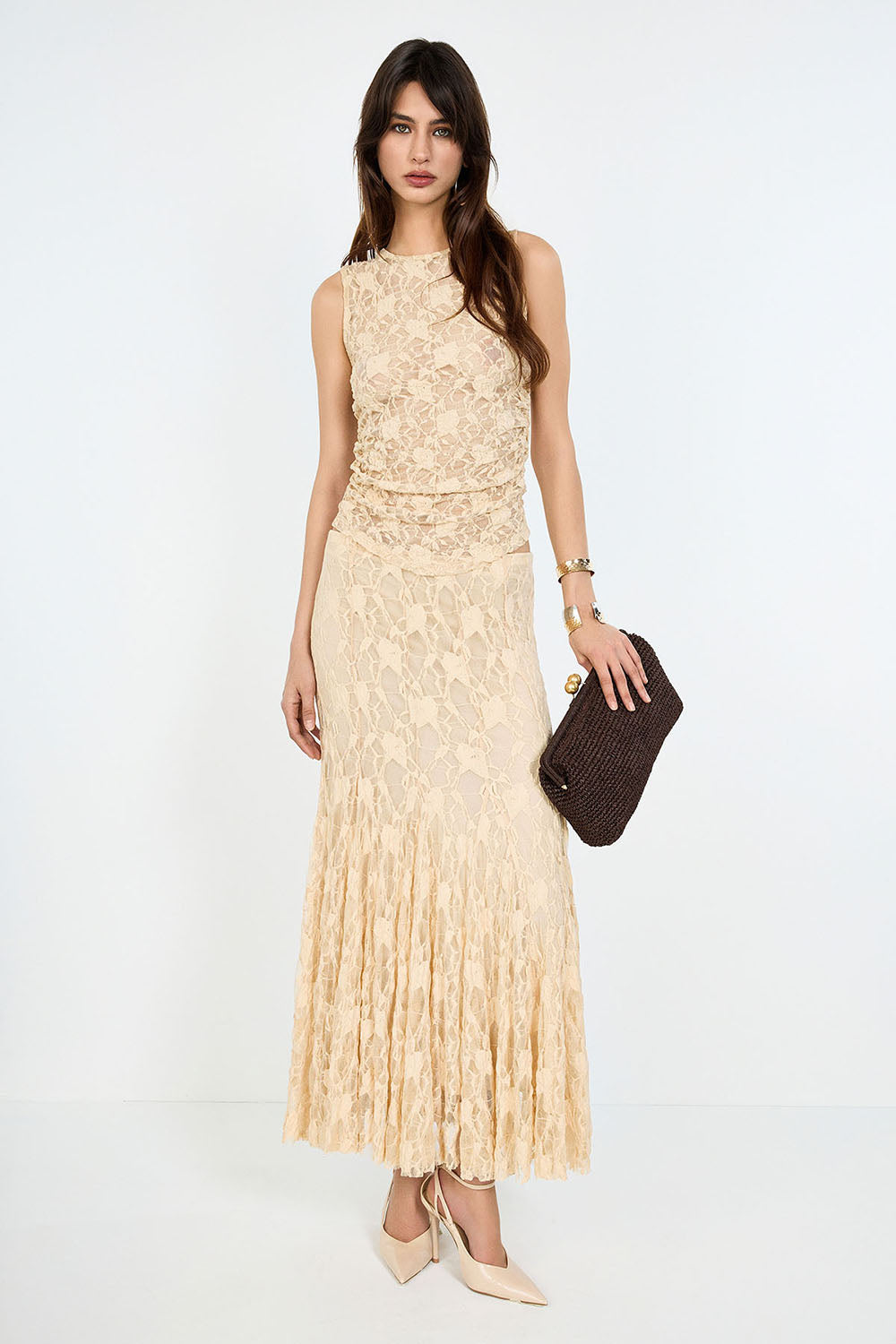 Volan Detaylı Dantel Maxi Etek ile kombinleyerek şık ve zarif bir görünüm elde edebilceğiniz bu top astarsız ve transparan görünümü ile cesur ve stil sahibi bir duruş sunuyor.