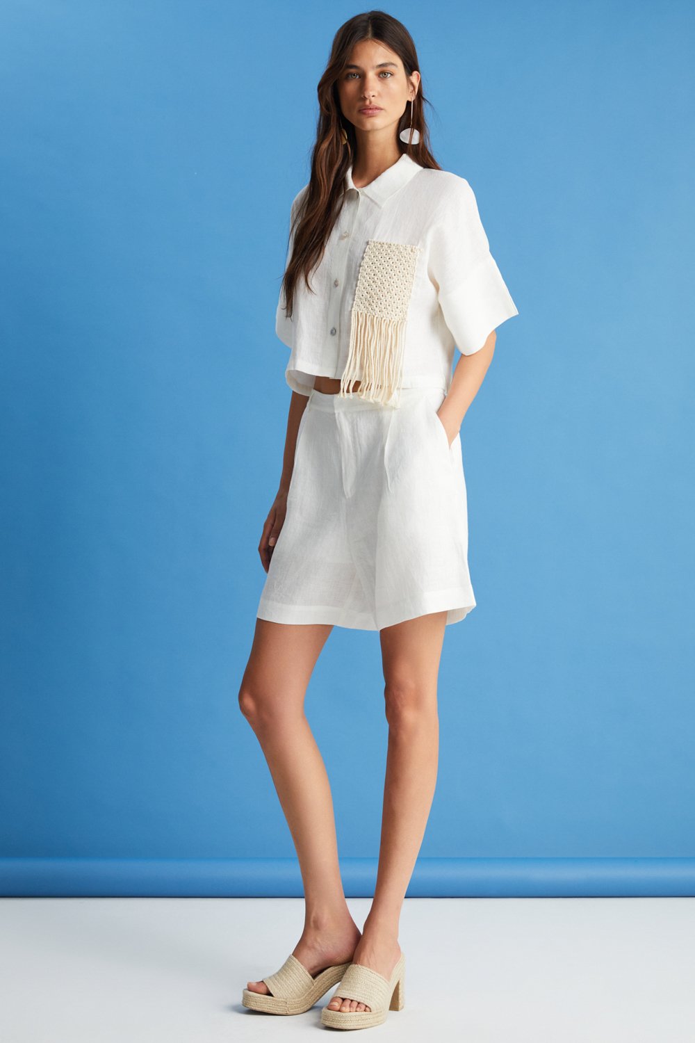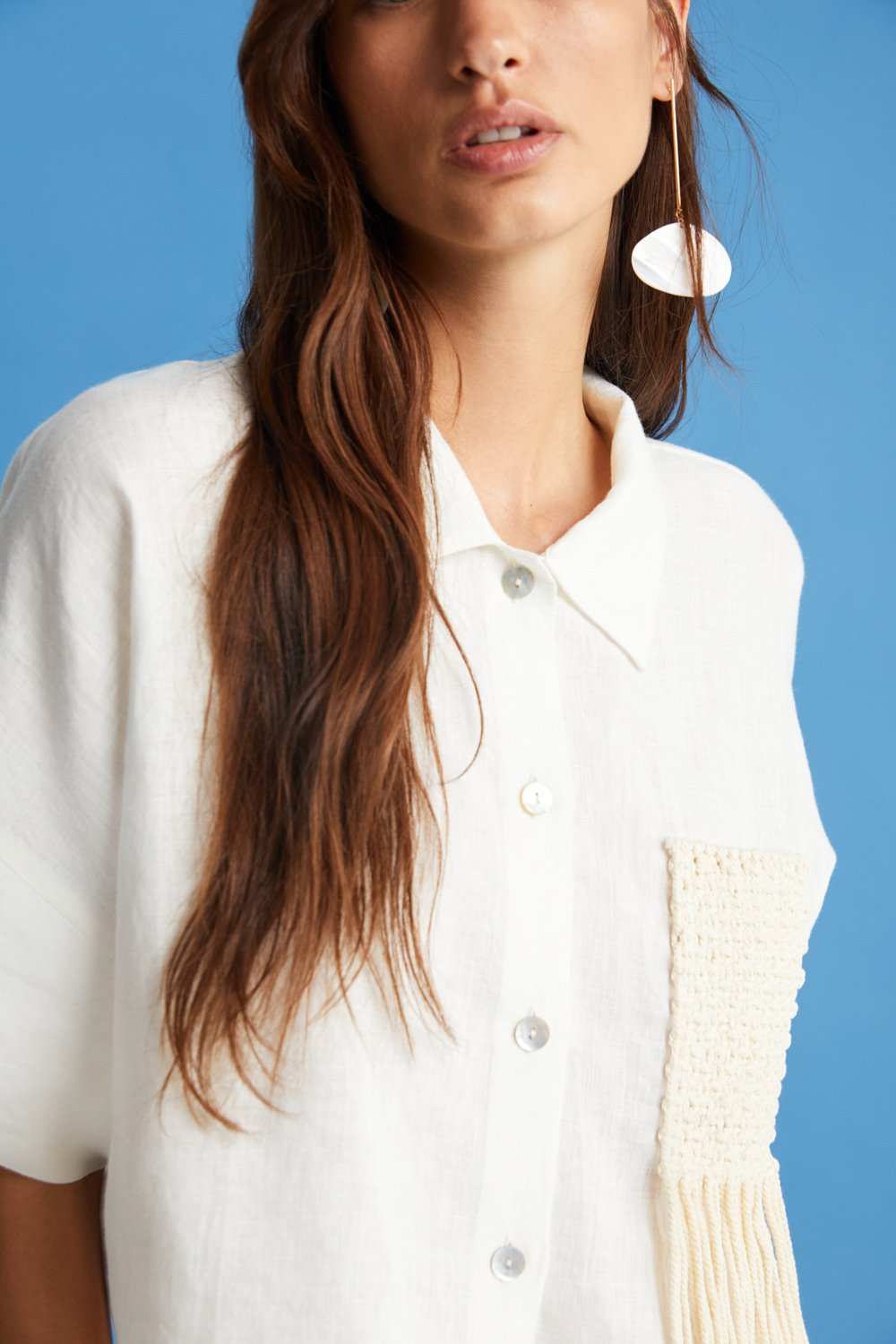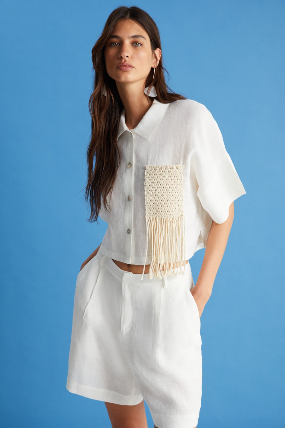 Kısa kesimli, ekru renk seçeneği ile sunulan gömleğimiz, sonsuz kıyafet ve kombin olanağı sağlayacak klasik bir parça olarak gardırobunuzun vazgeçilmezidir. %100 ketenden üretilen bu tasarımımız zarif bir yaka detayıyla ön plana çıkıyor. %100 tığ işi saçaklı cep detayıyla tamamen özgün bir stil sunuyor. Uyumlu aynı renkteki şortumuzla takım halinde kombinleyebilir veya yüksek belli pantolonlarımızla eşleştirebilirsiniz.
