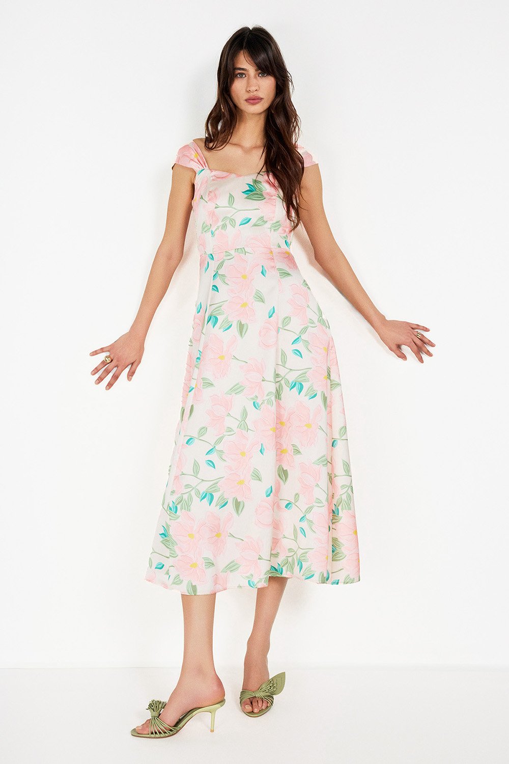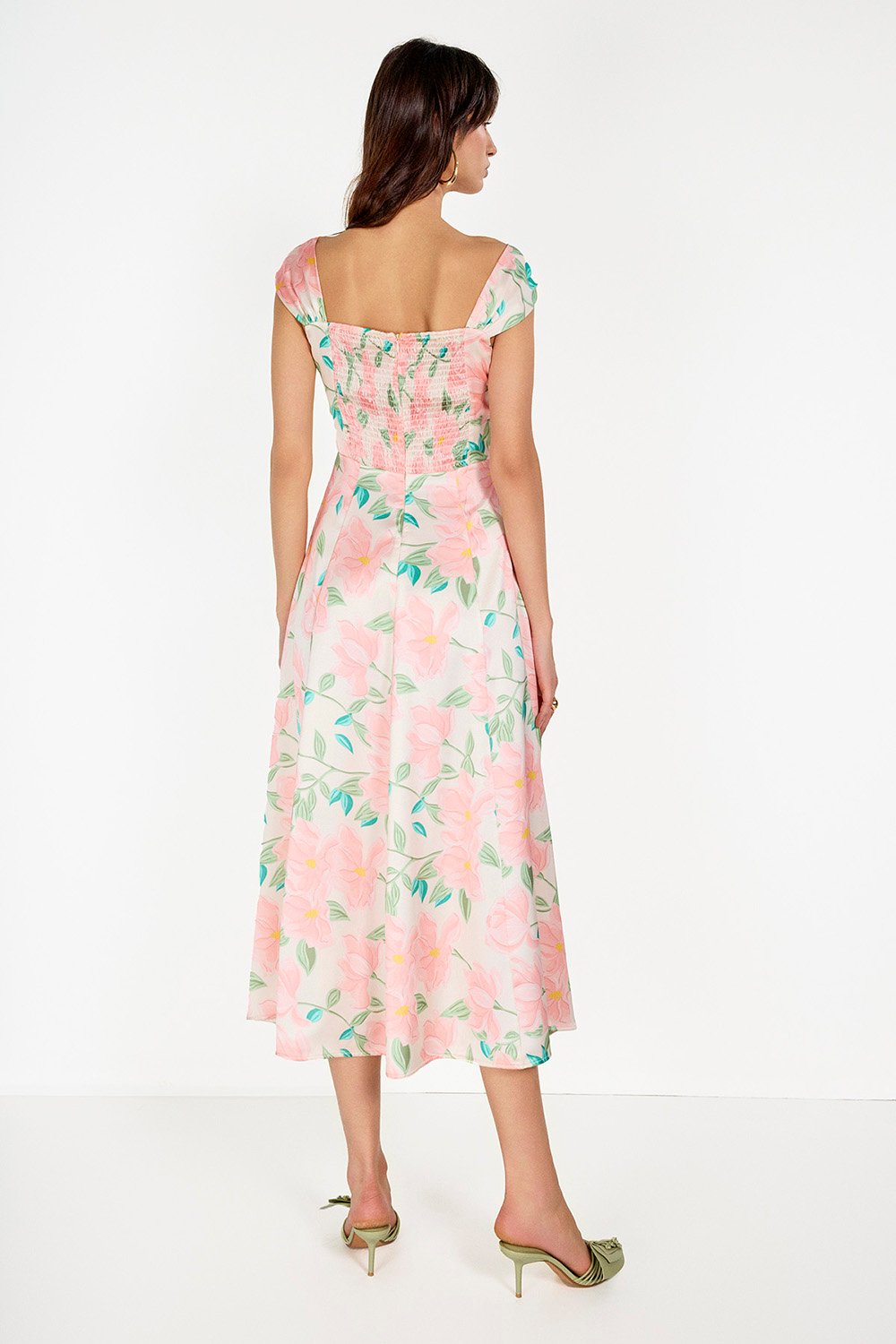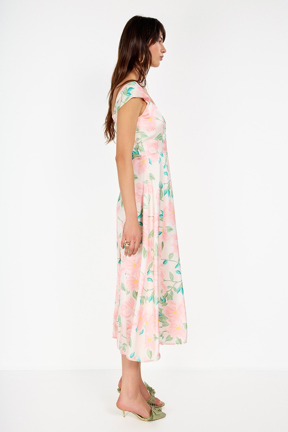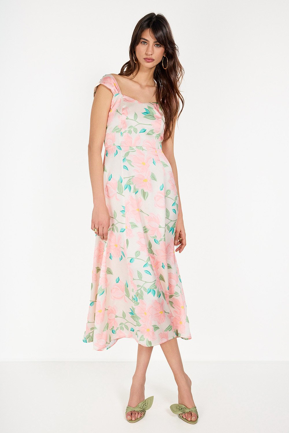 Çiçek Baskılı Saten Midi Elbise