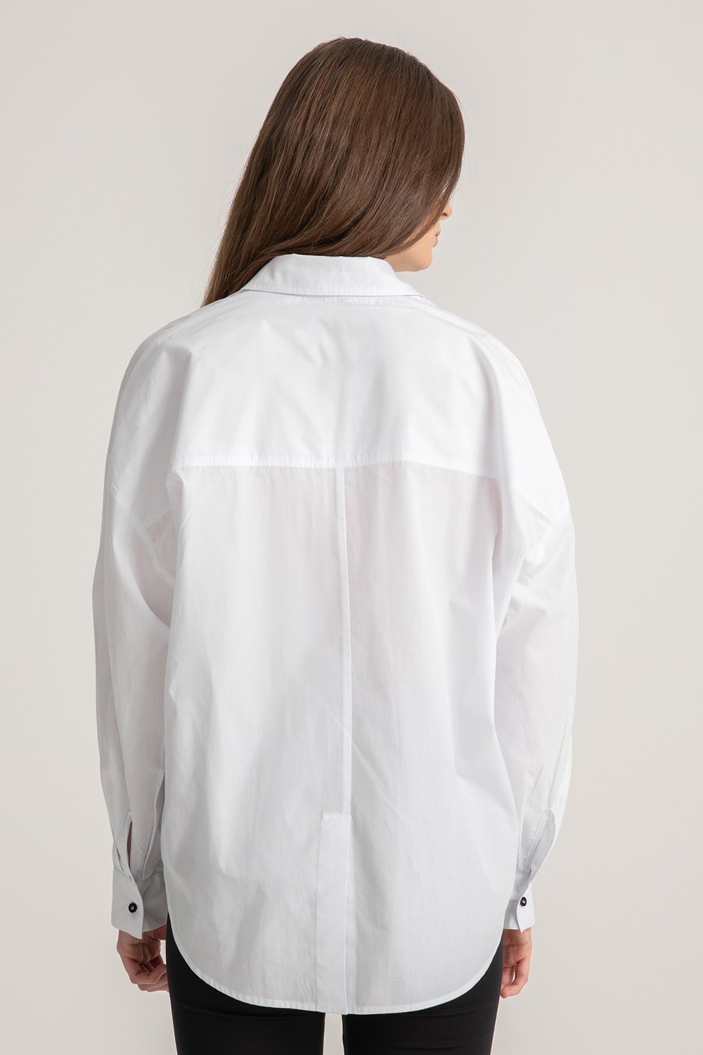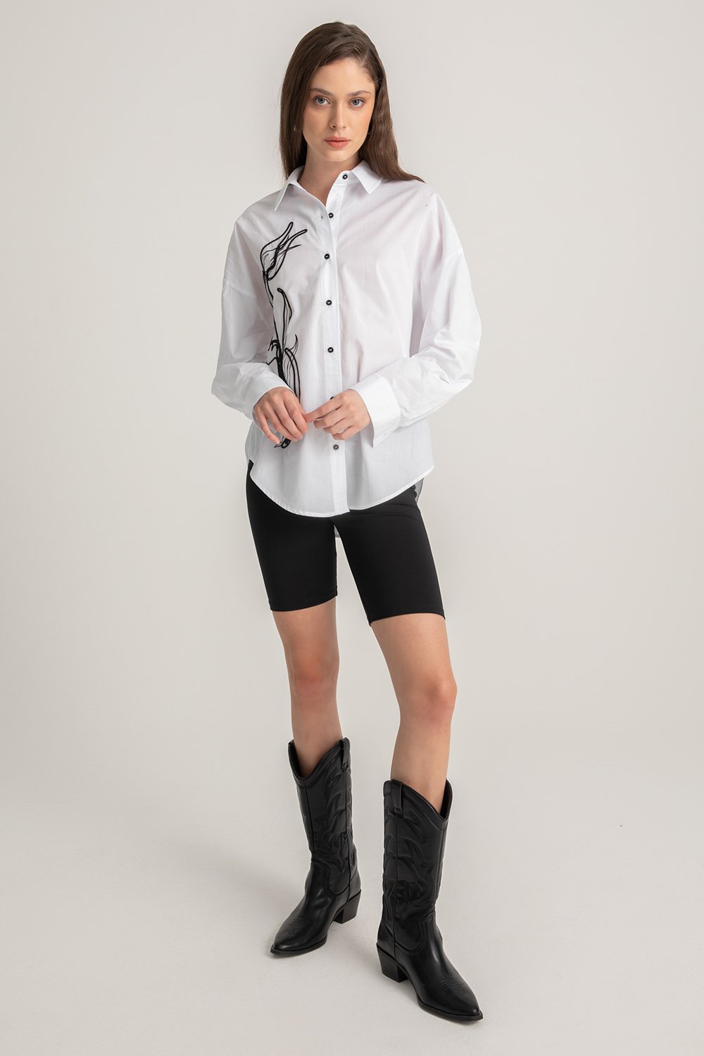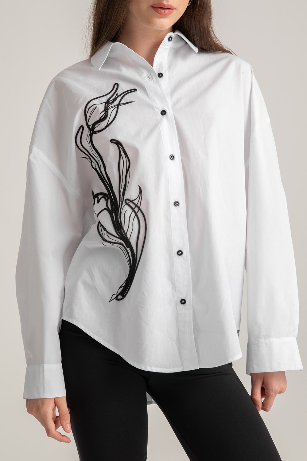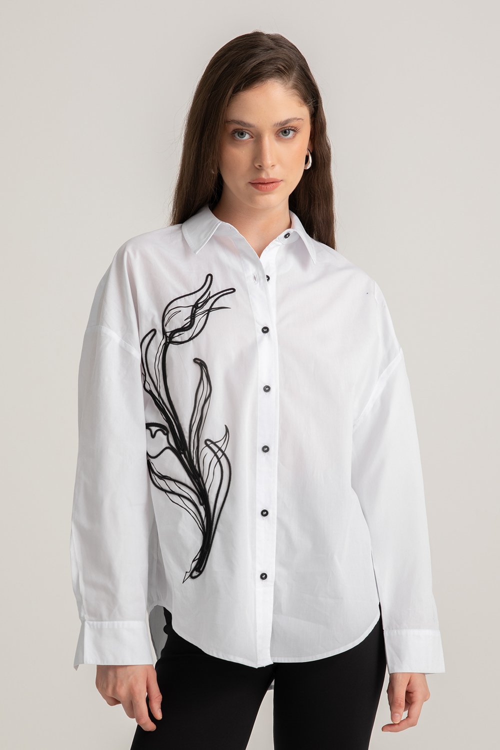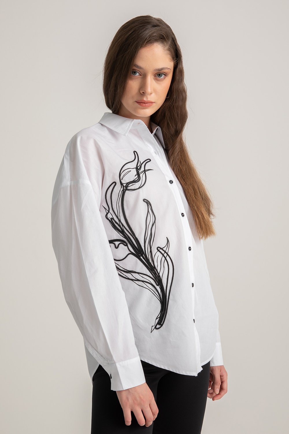 %100 pamuklu poplinden üretilen bu doku efektli zarif beyaz gömlek, normal kesime sahiptir ve ön kısmında "EBRU LALE" çiçeğinden ilham alan işlemeler bulunur.