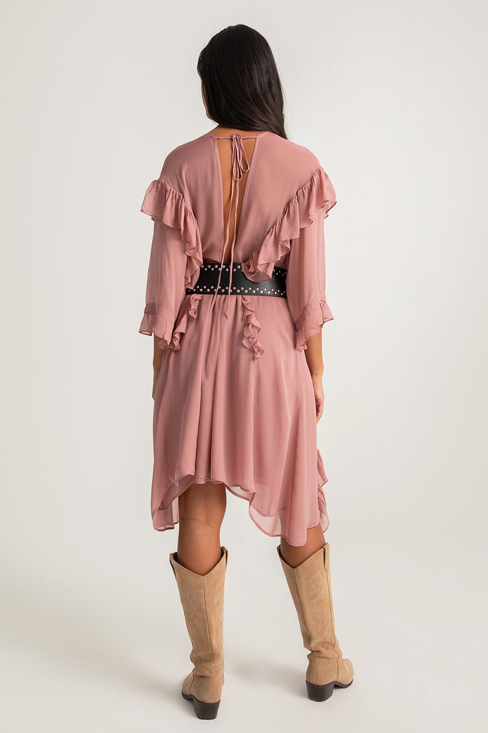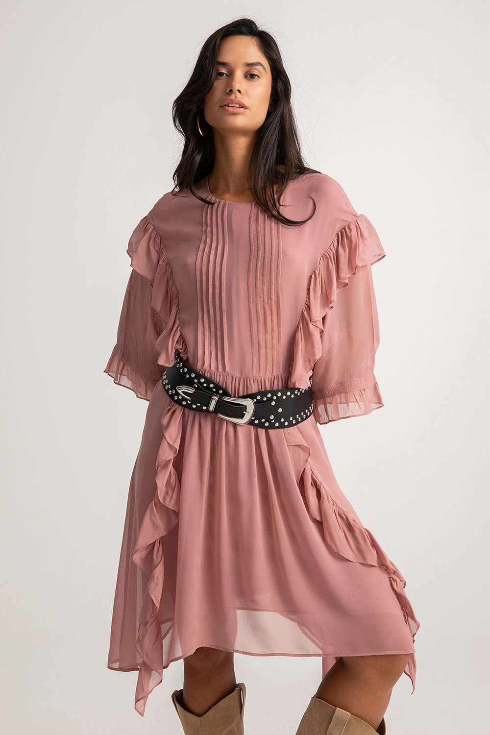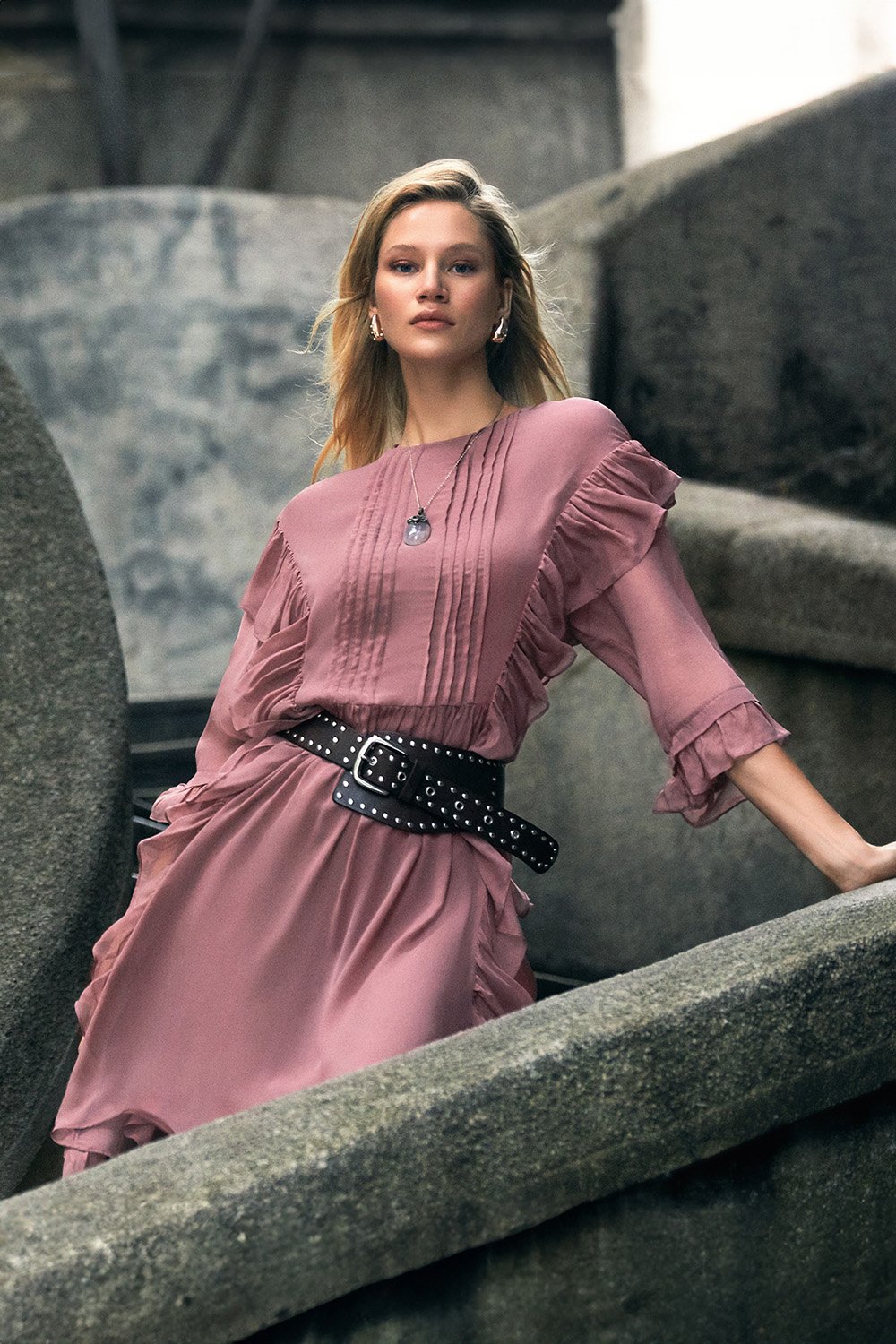 Bu romantik, dökümlü kısa elbise, kadınsılığın ve zarafetin bir buluşmasıdır. 100 RAYON viskon şifondan üretilen bu elbise, attığınız her adımda hareket ve hacim yaratarak görünümünüze şıklık katar. Tasarım, bu sezonun en önemli trendi olan fırfırları kucaklayarak esintili günlerde dans eden eğlenceli ama zarif bir dokunuş katıyor. Narin bir fiyonkla süslenmiş açık sırtı, bir parça duygusallık katarak bu elbiseyi hem kendinden emin hem de çekici hissetmek istediğiniz anlar için mükemmel kılar. İster akşam dışarı çıkarken yüksek topuklu ayakkabılarla ister gündüz şık bir görünüm için diz boyu botlarla eşleştirin, bu elbise zahmetsiz romantizmi ve zamansız stili ifade etmek için başvuracağınız parçadır. Her giydiğinizde kumaşın canlandığını, doğal güzelliğinizi artırdığını ve etrafınızdakileri büyülediğini hissedeceksiniz.