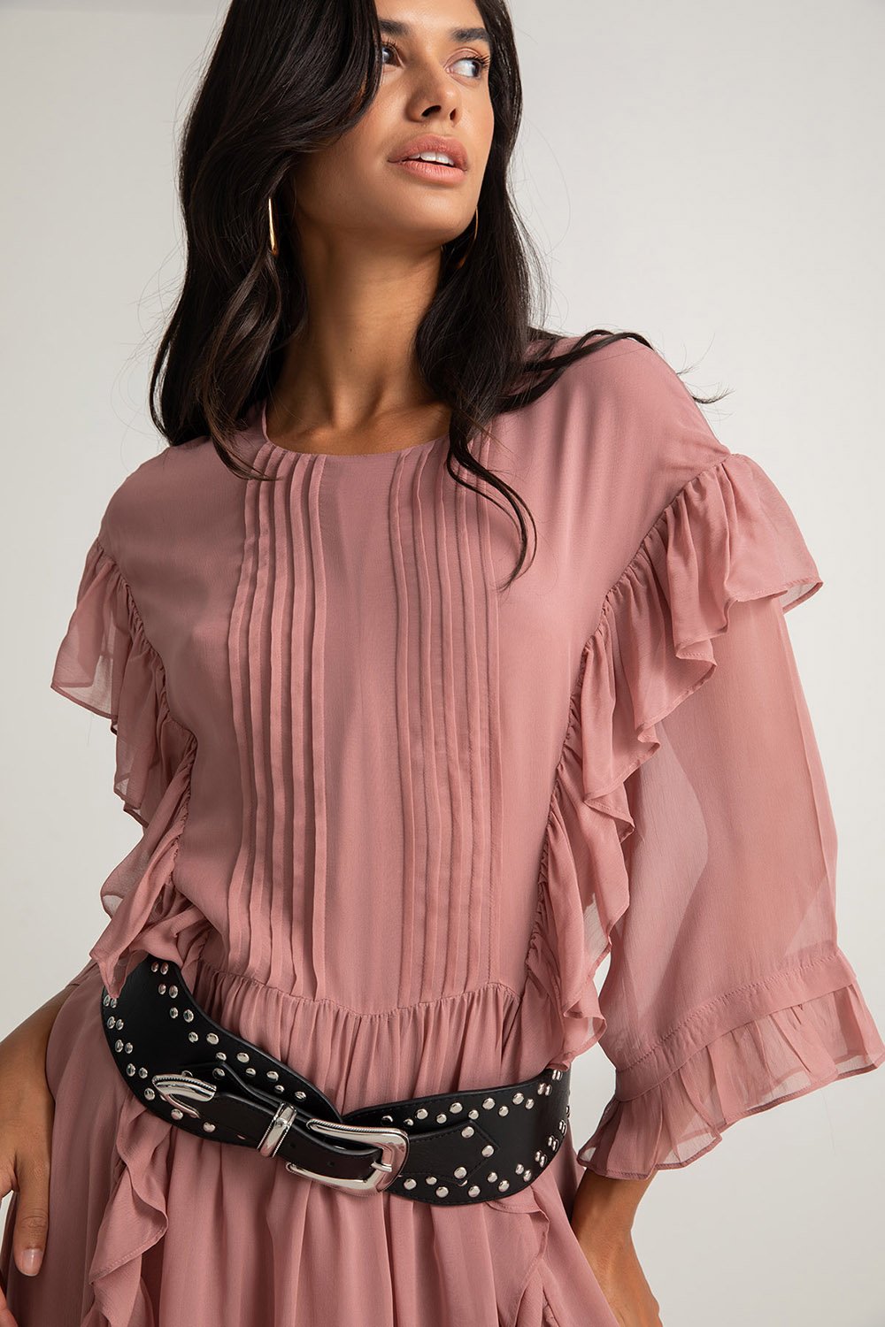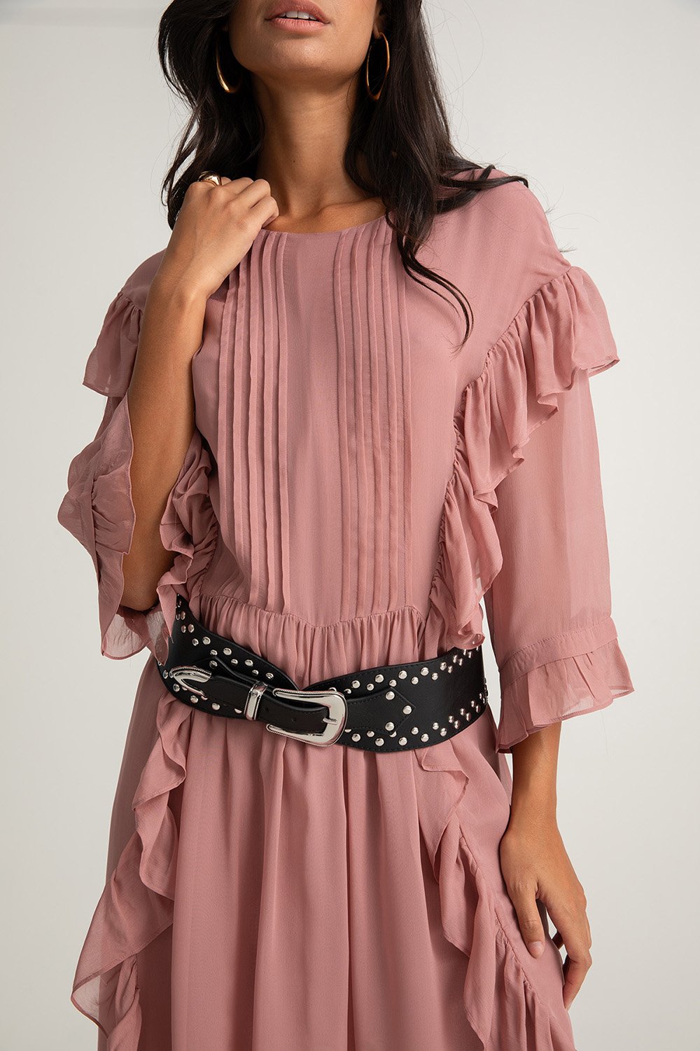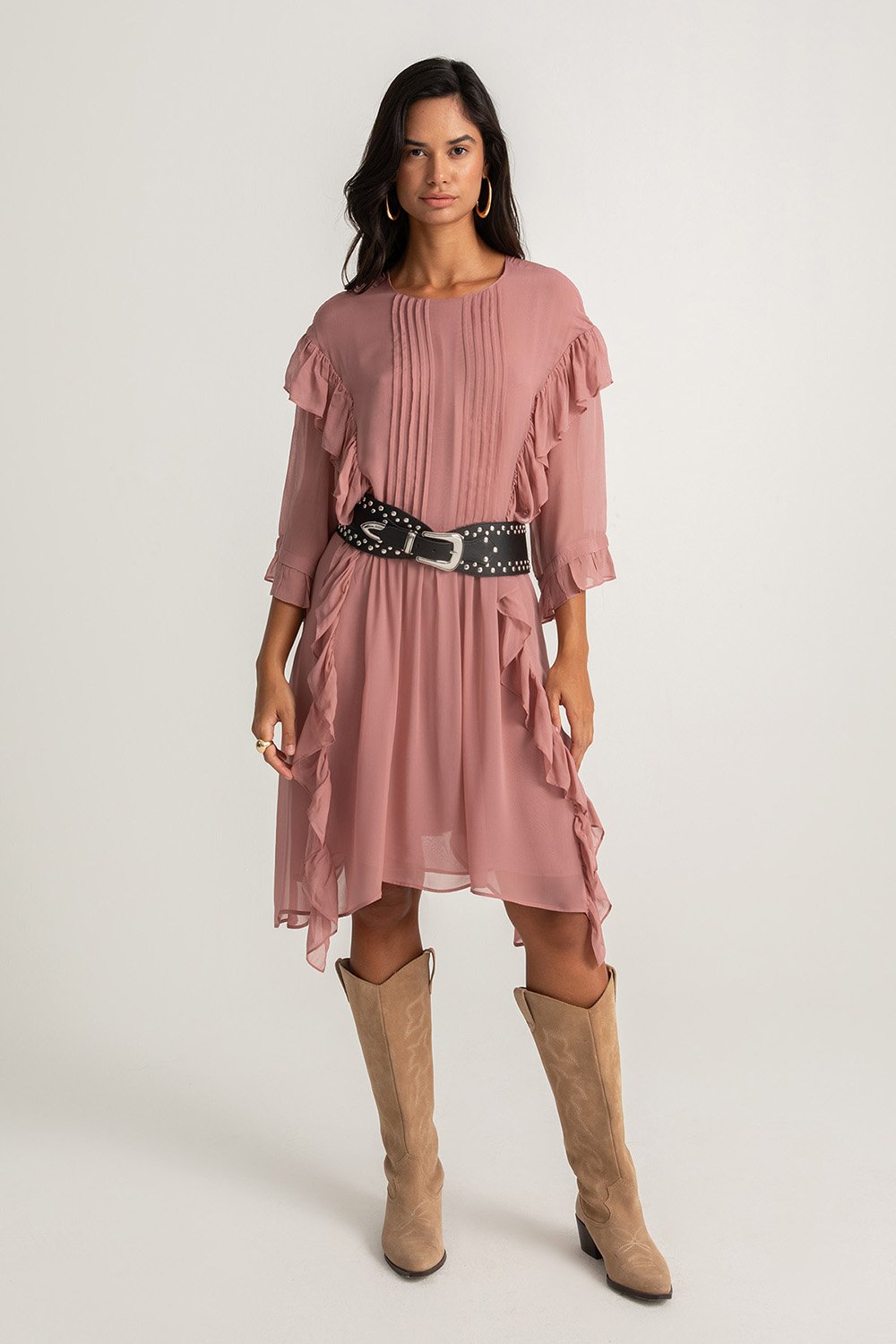Bu romantik, dökümlü kısa elbise, kadınsılığın ve zarafetin bir buluşmasıdır. 100 RAYON viskon şifondan üretilen bu elbise, attığınız her adımda hareket ve hacim yaratarak görünümünüze şıklık katar. Tasarım, bu sezonun en önemli trendi olan fırfırları kucaklayarak esintili günlerde dans eden eğlenceli ama zarif bir dokunuş katıyor. Narin bir fiyonkla süslenmiş açık sırtı, bir parça duygusallık katarak bu elbiseyi hem kendinden emin hem de çekici hissetmek istediğiniz anlar için mükemmel kılar. İster akşam dışarı çıkarken yüksek topuklu ayakkabılarla ister gündüz şık bir görünüm için diz boyu botlarla eşleştirin, bu elbise zahmetsiz romantizmi ve zamansız stili ifade etmek için başvuracağınız parçadır. Her giydiğinizde kumaşın canlandığını, doğal güzelliğinizi artırdığını ve etrafınızdakileri büyülediğini hissedeceksiniz.