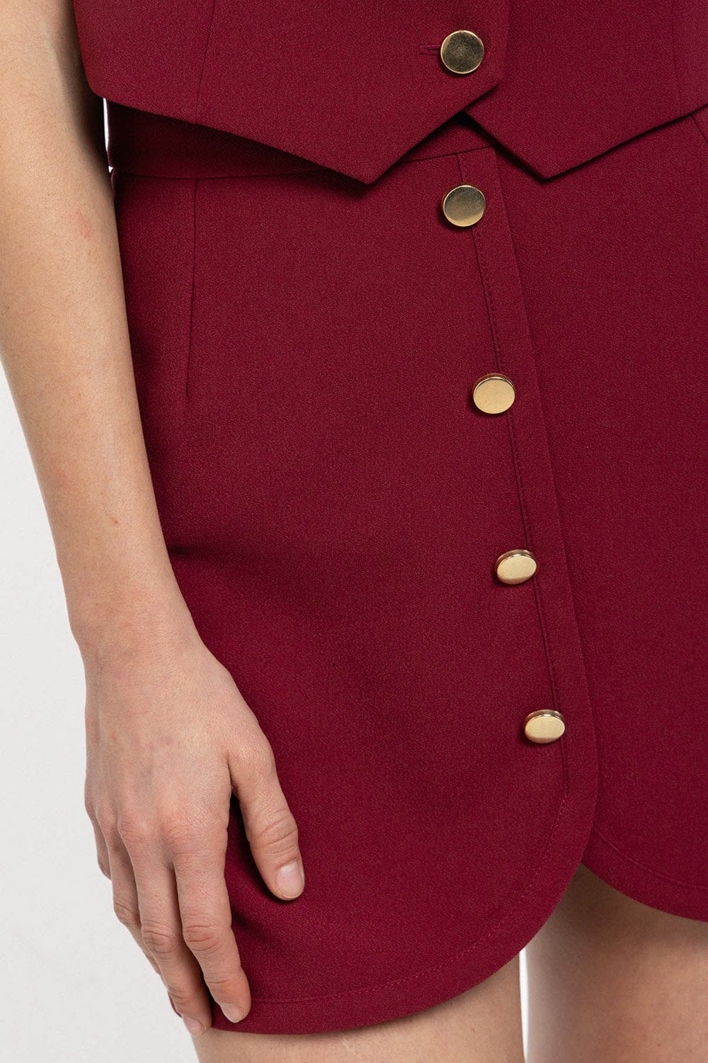 Boneqa SS 25 Capsule Drop 1 koleksiyonunun öne çıkan aksesuarı gold düğme bu etek tasarımında da göze çarpıyor.
