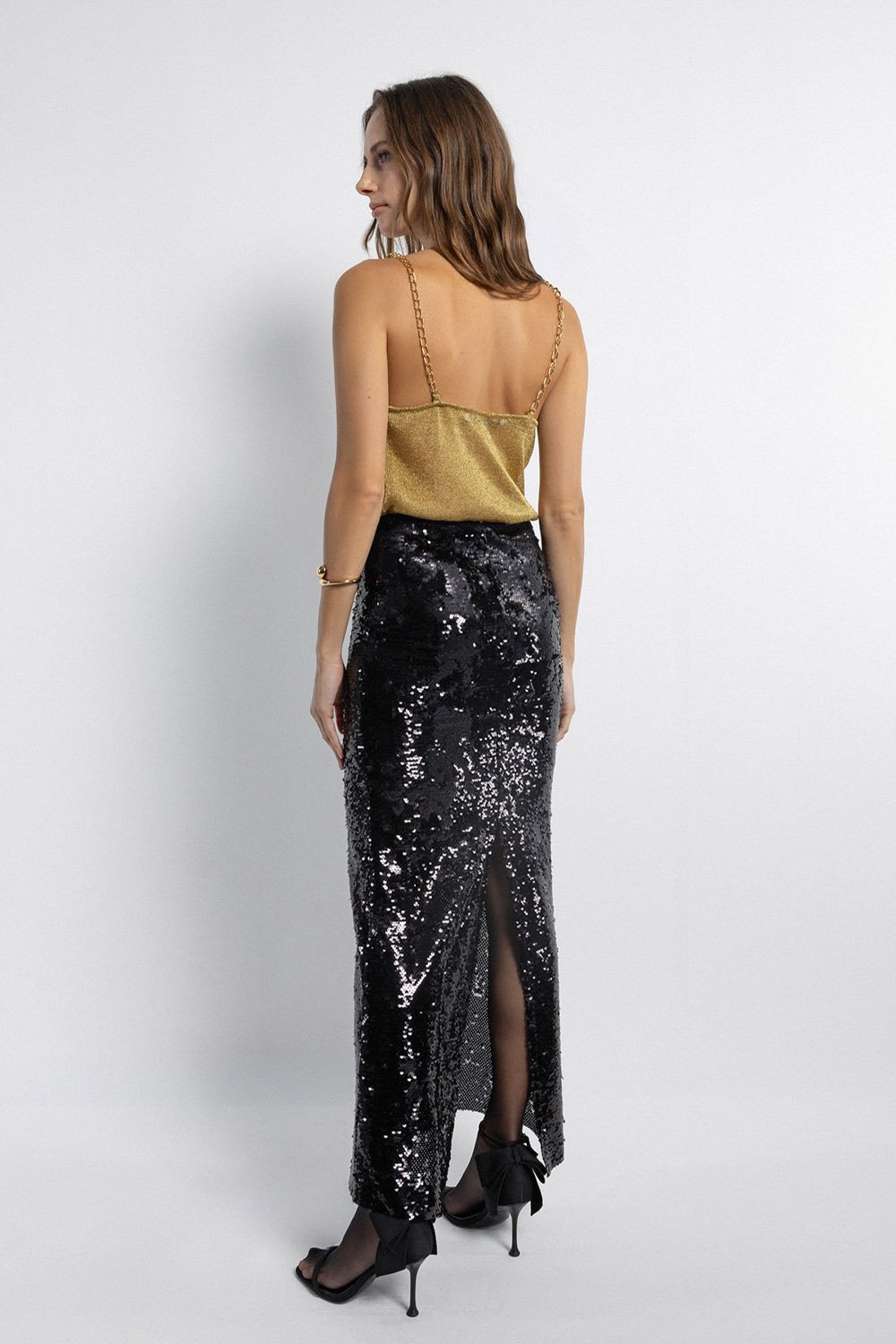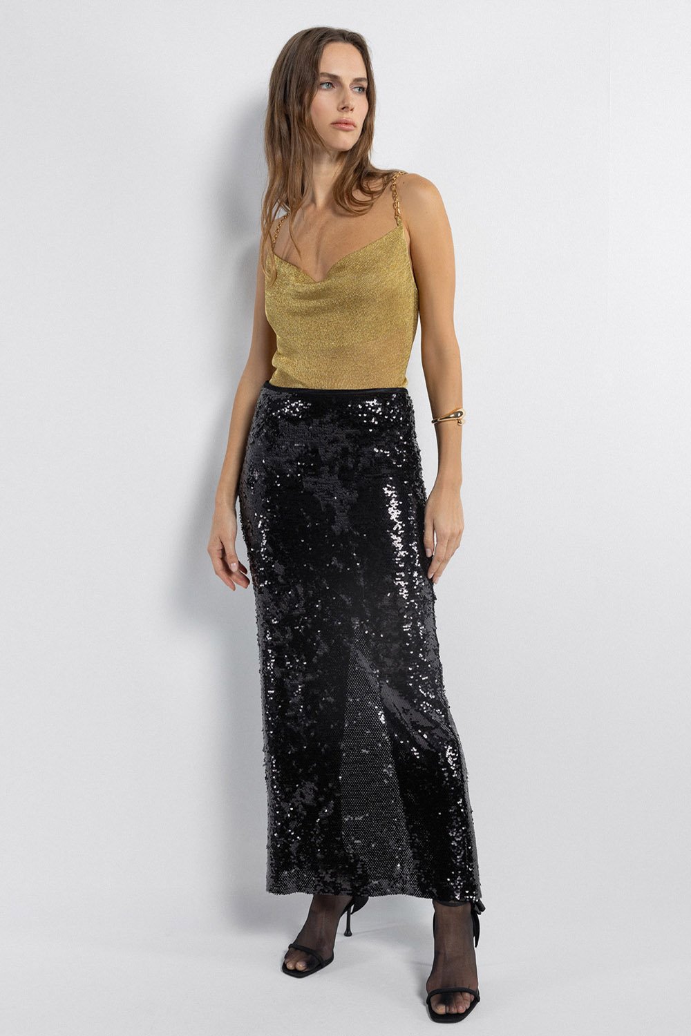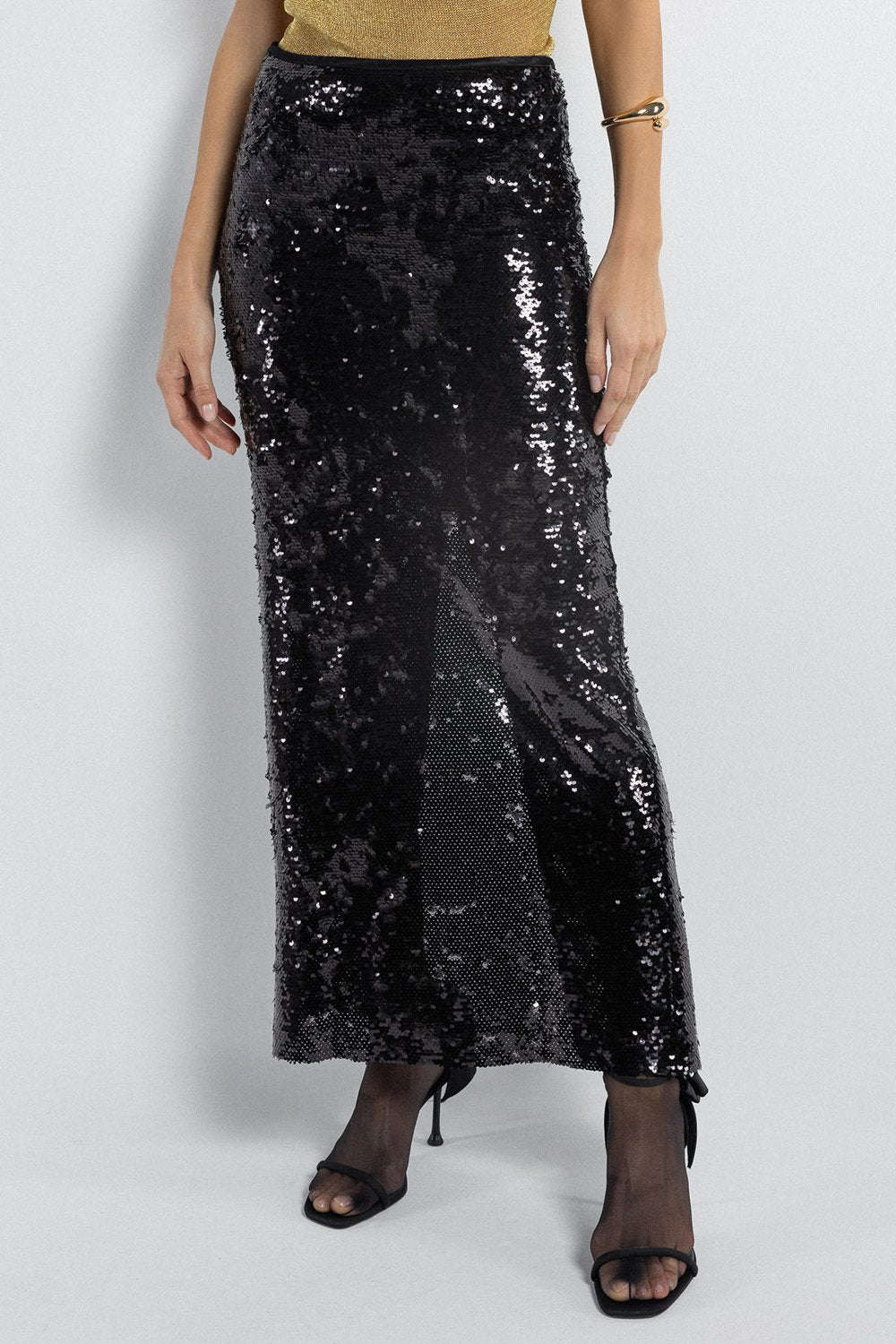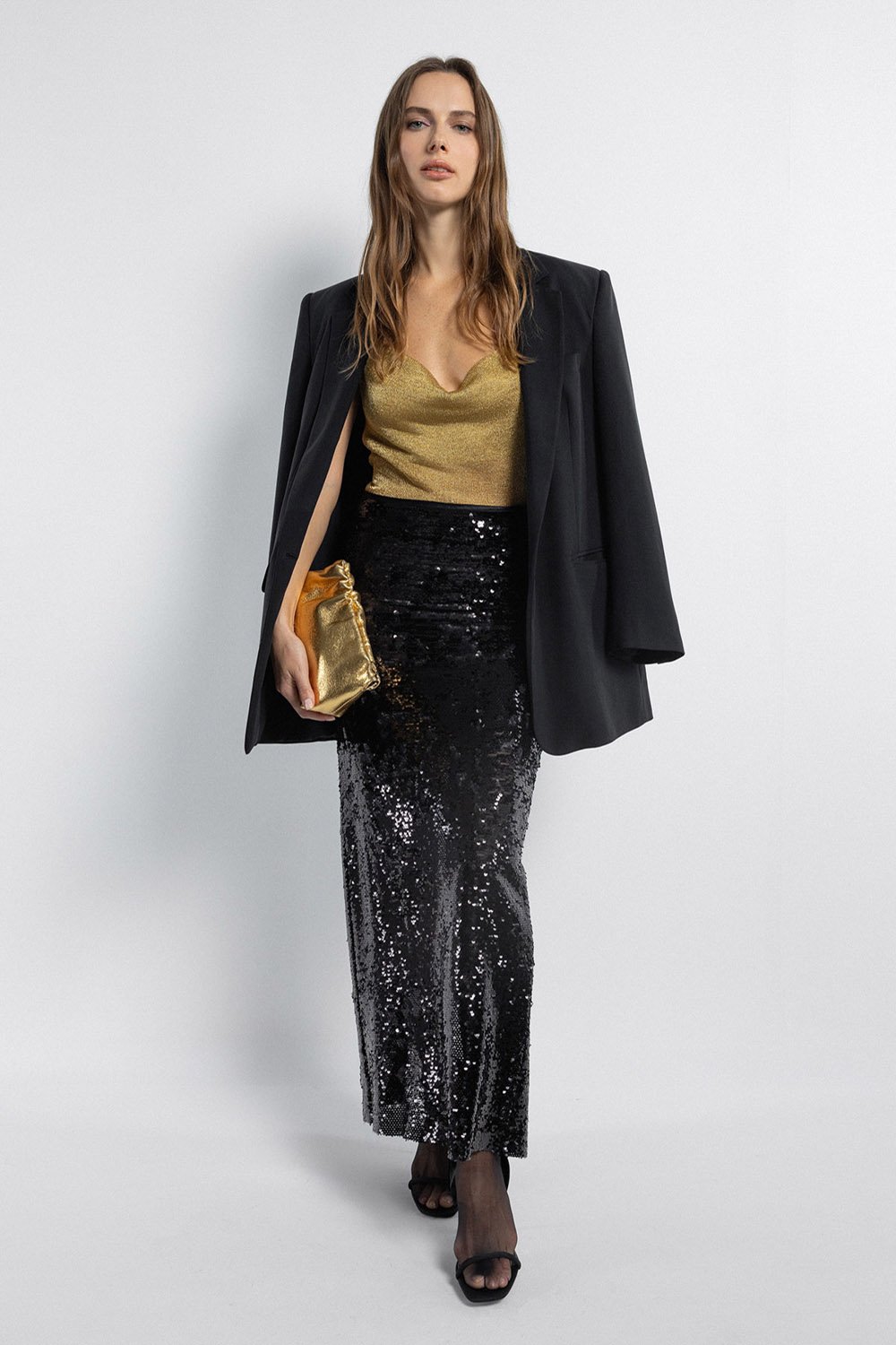 Dar kesimiyle vücuda oturan ve şık bir silüet oluşturan bu pul payetli siyah etek bluz ve ceket ile de kombinleyeceğiniz harika bir parti kombini parçasıdır.