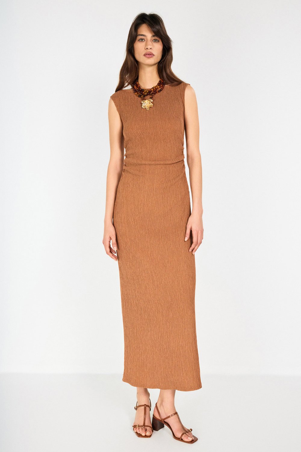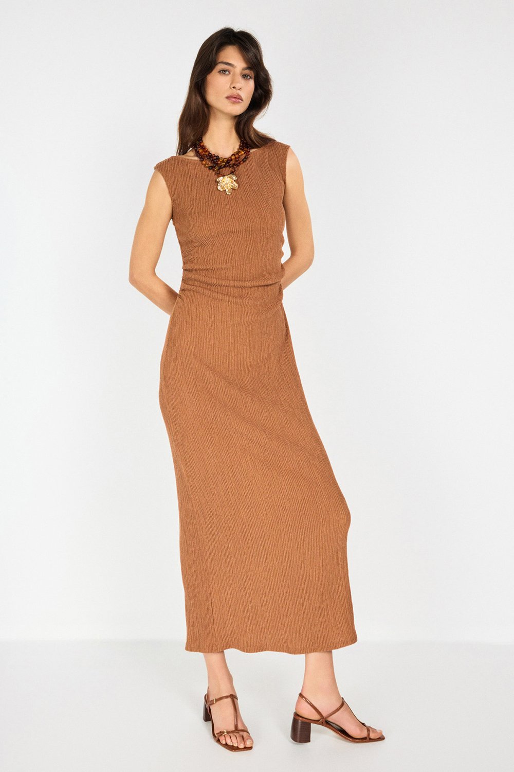 Tarçın ve mint yeşili tonlarındaki tek parça elbise bürümcük kumaş dokusu ile görünümü boyutlandırırken yan büzgü detayları ve sırt dekoltesi ile günlük ve özel buluşmalar için kullanım seçenekleri oluşturuyor.