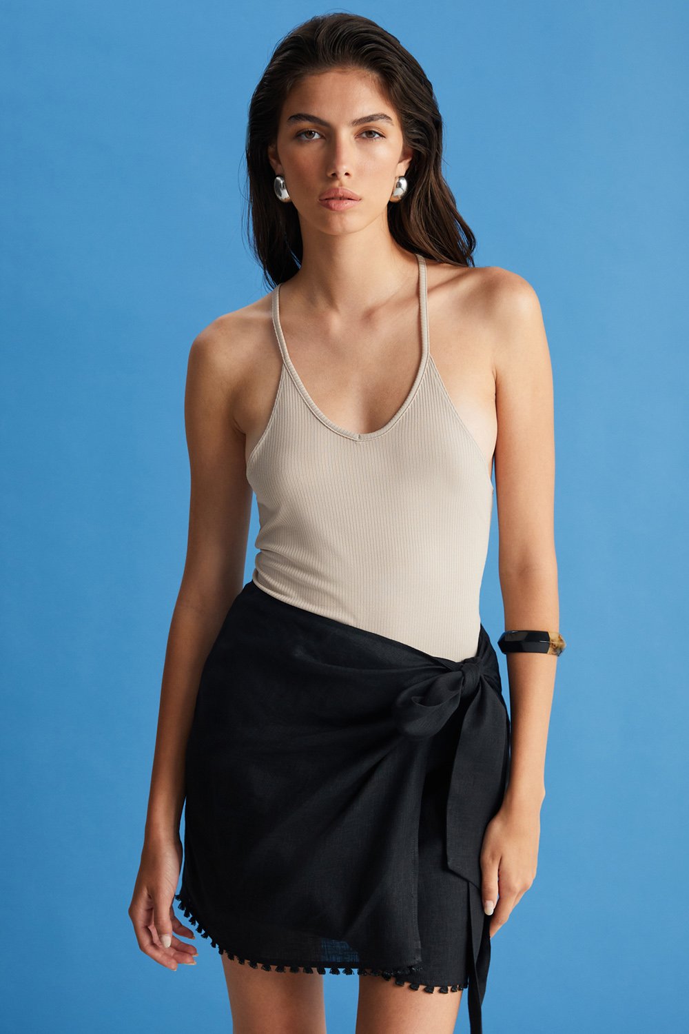 Slim, askılı ve yarışçı sırtlı, boyundan bağlı ince askılı üst. Karışımlı fitilli kumaştan üretilmiştir.
