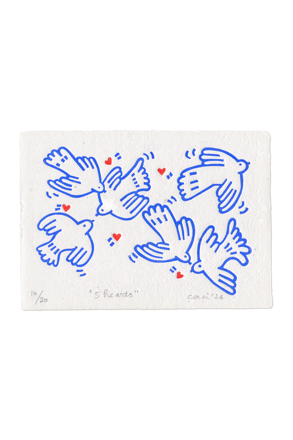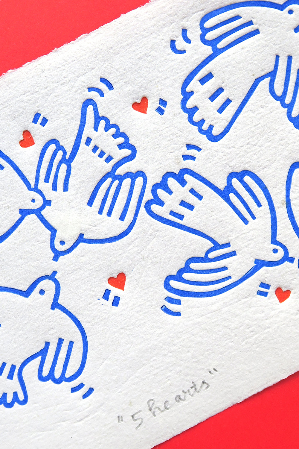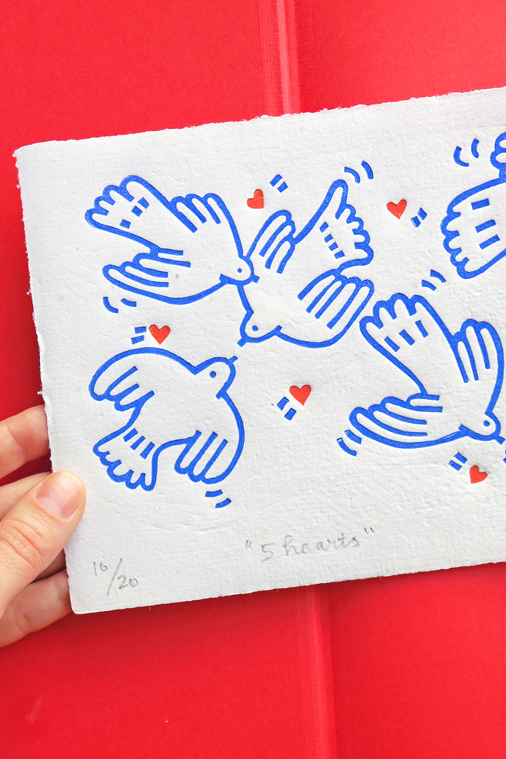 * Geri dönüştürülmüş el yapımı kağıt üzerine 2 renkli linol baskı.