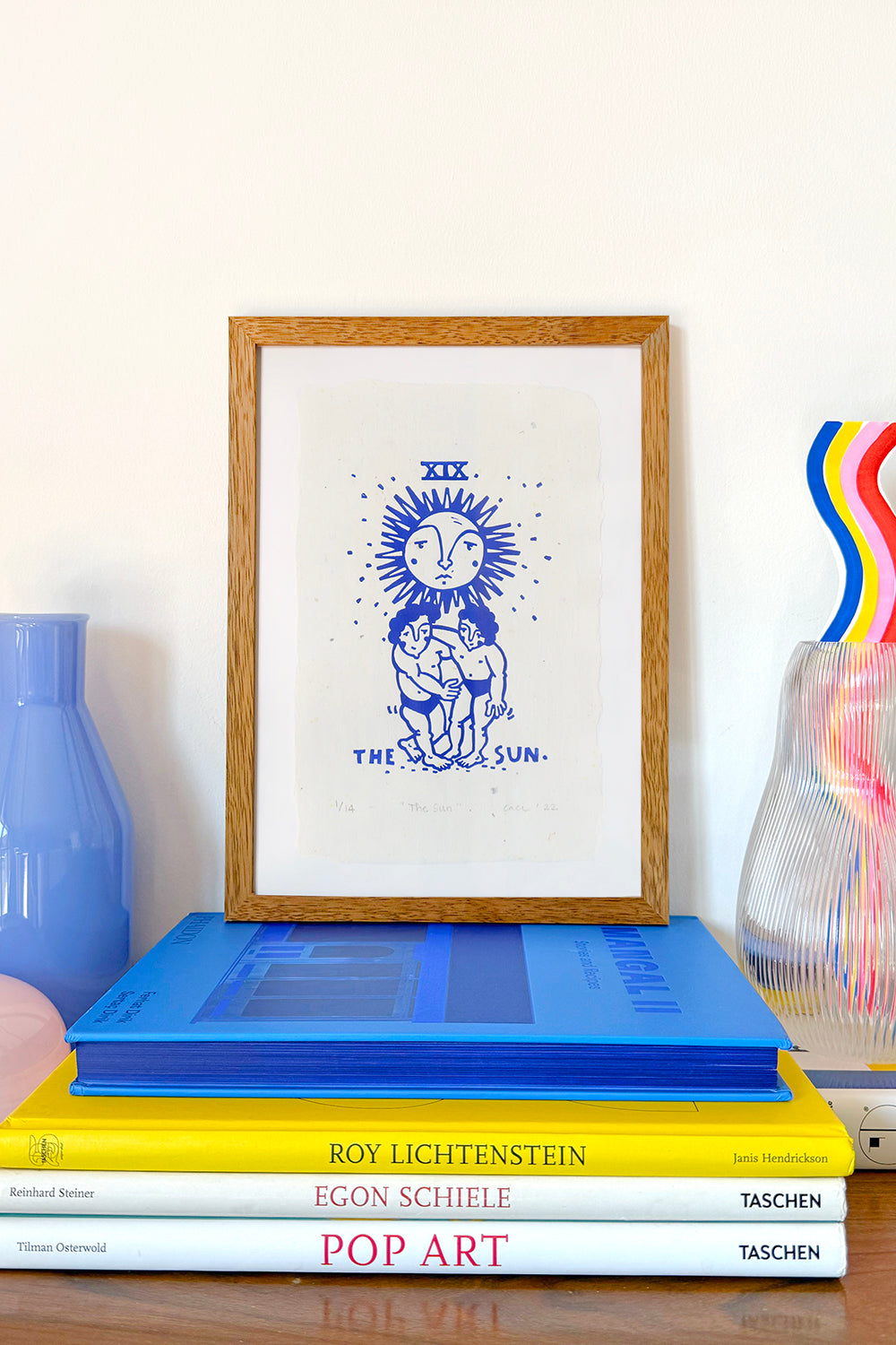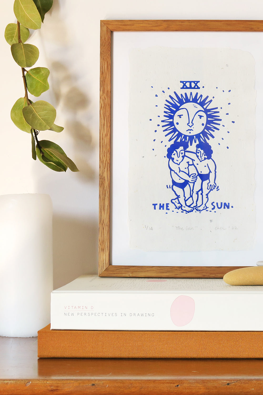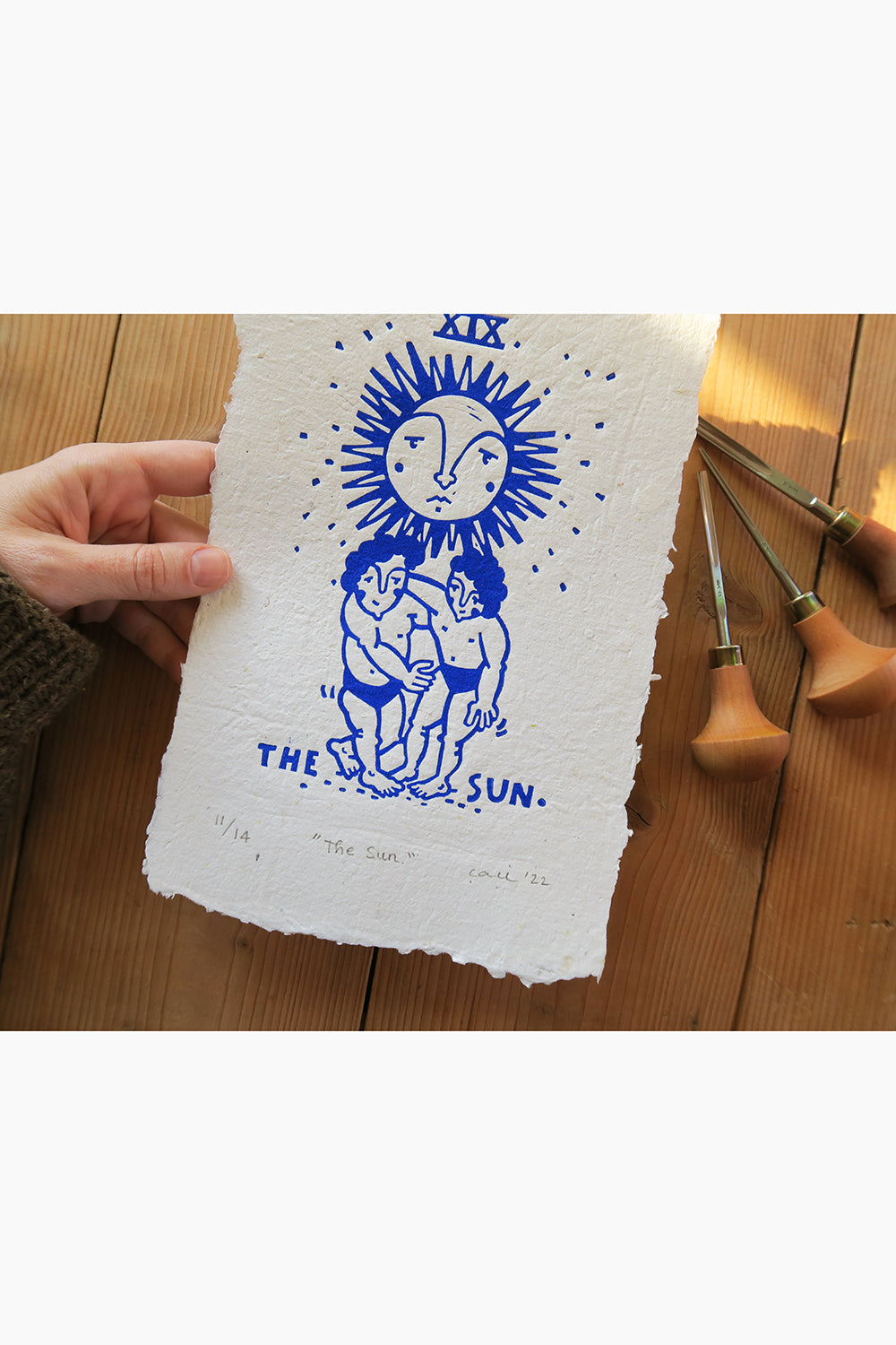 Güneş tarot kartı, genellikle başarı, mutluluk, pozitiflik ve yaşam sevinci gibi temaları simgeler. Zorlukların ardından gelen aydınlık bir dönemi işaret eder. Kartın ortasındaki parlayan güneş, aydınlanma ve başarıyı simgelerken, çocuklar ise saflık, masumiyet ve neşeyi temsil eder. Bu linol baskının hayatınıza neşe getirmesini umuyoruz.