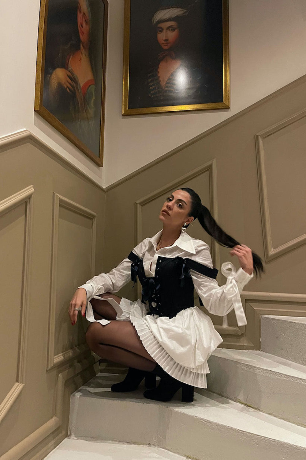 Özel tasarım gömlek elbise ve önden bağlanabilen fonksiyonel askılara sahip korse tasarımı.