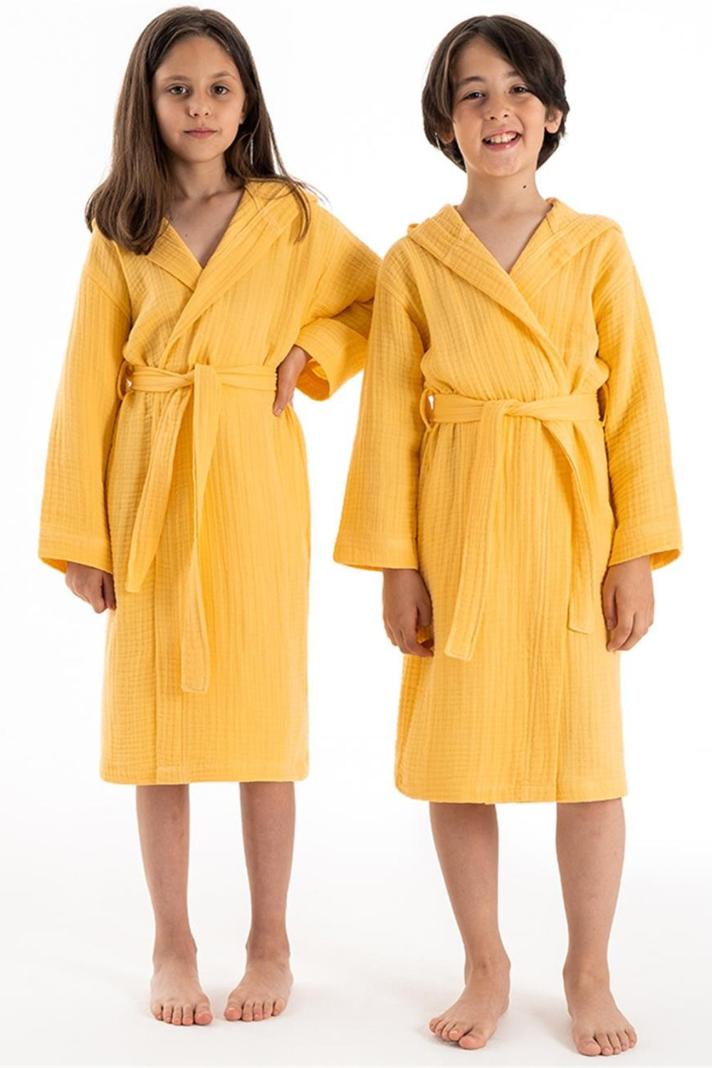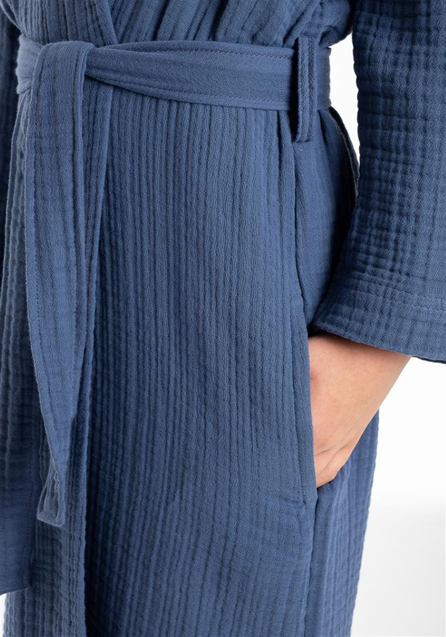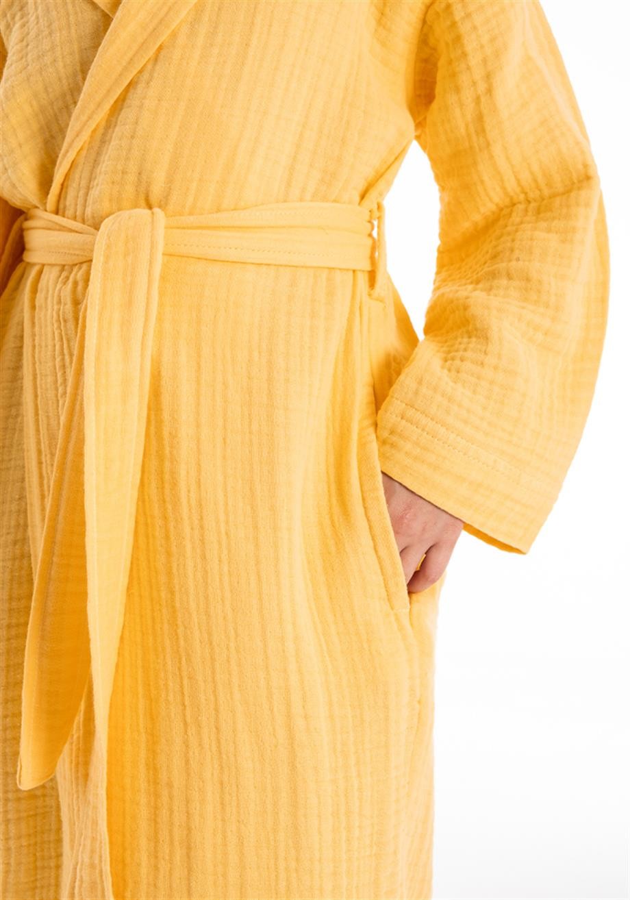 Kapşonlu müslin bornoz 1. kalite %100 pamuk ipliğinden üretilmiştir. Yıkama işlemi yapılmıştır ve yıkandıkça yumuşaklığını koruyacaktır. Efektli bir görünüme sahiptir. Kumaş nefes alabilen bir yapıda olduğu için banyo sonrası yüksek nem emiciliğine sahiptir ve hızlı kurur.