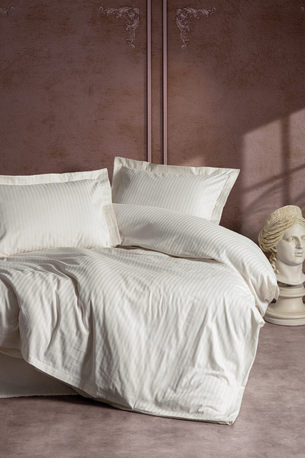 Elegant Stripe Saten Çift Kişilik Nevresim Takımı Ekru