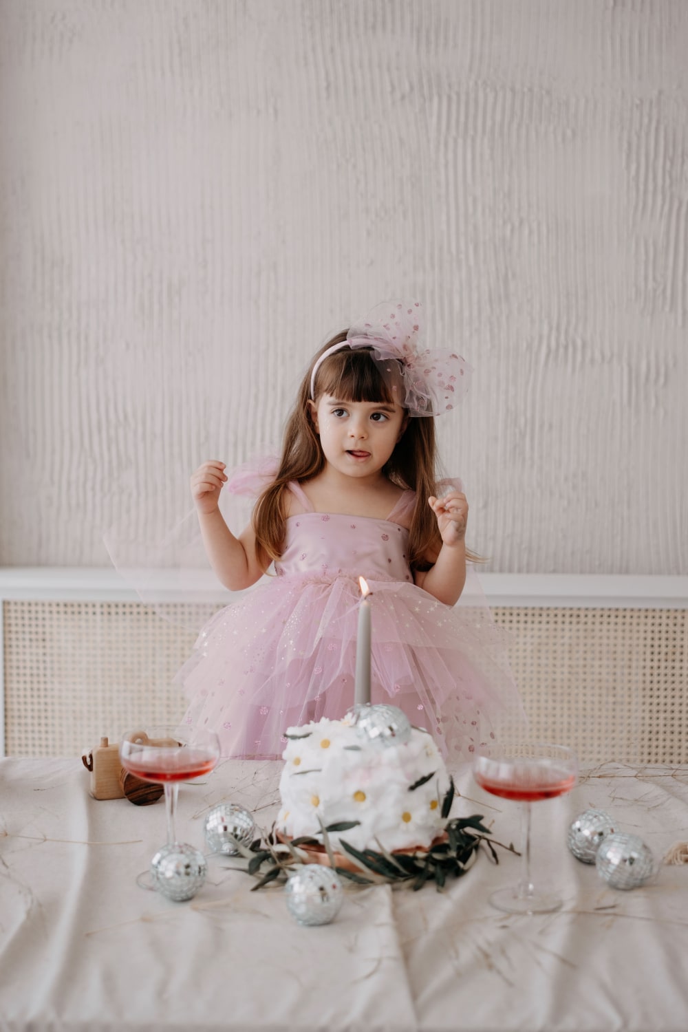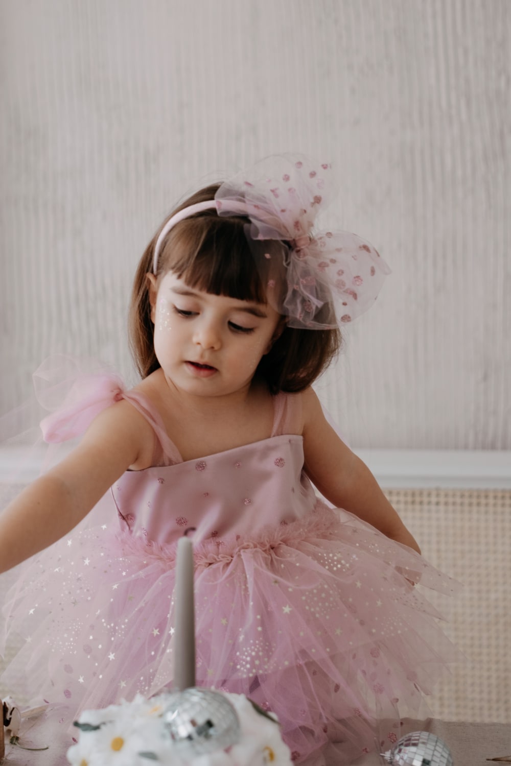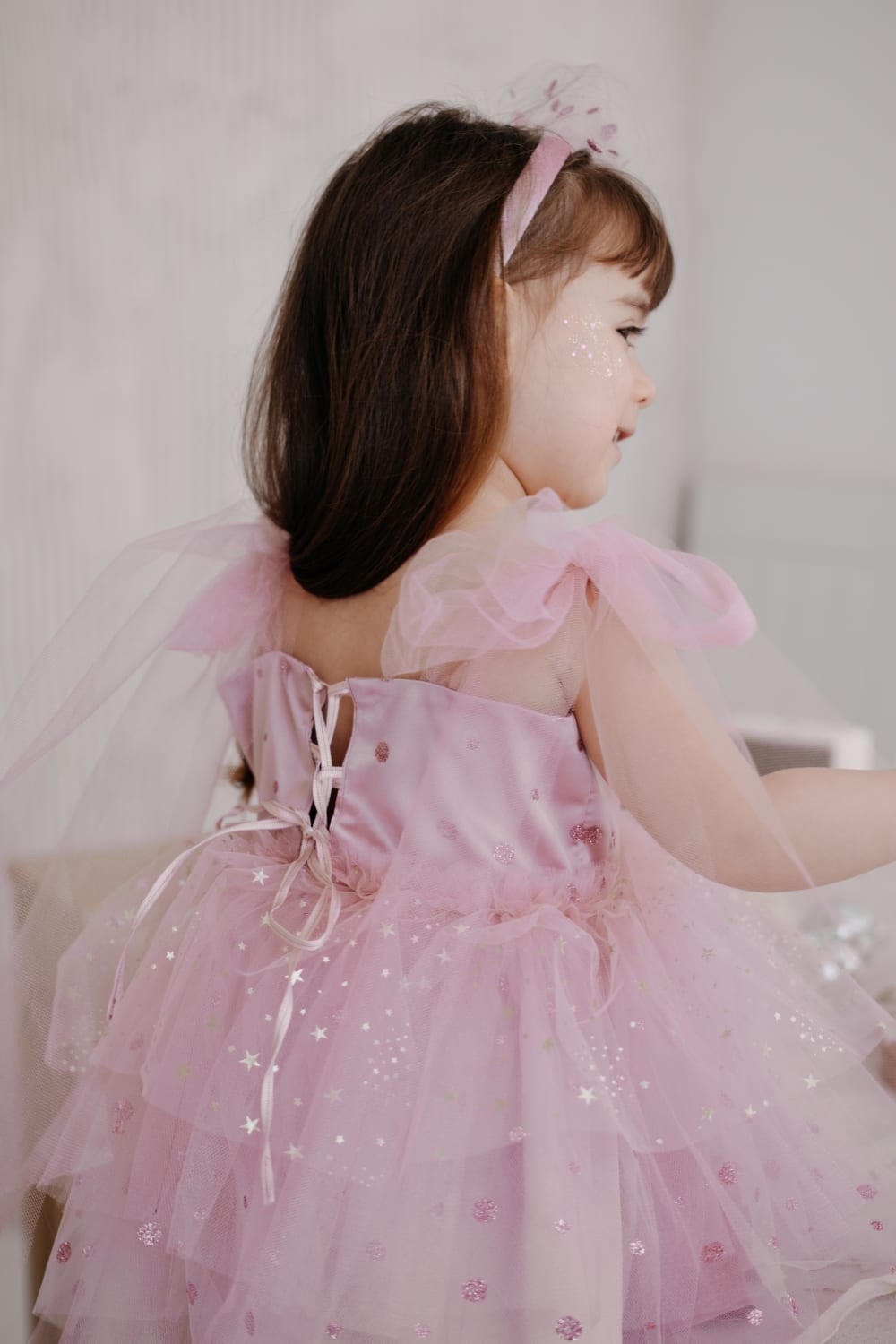 Askıları tül bağlama detaylı, saten astarlı, yıldız figürlü pembe parti elbisesi. Elde üretim.