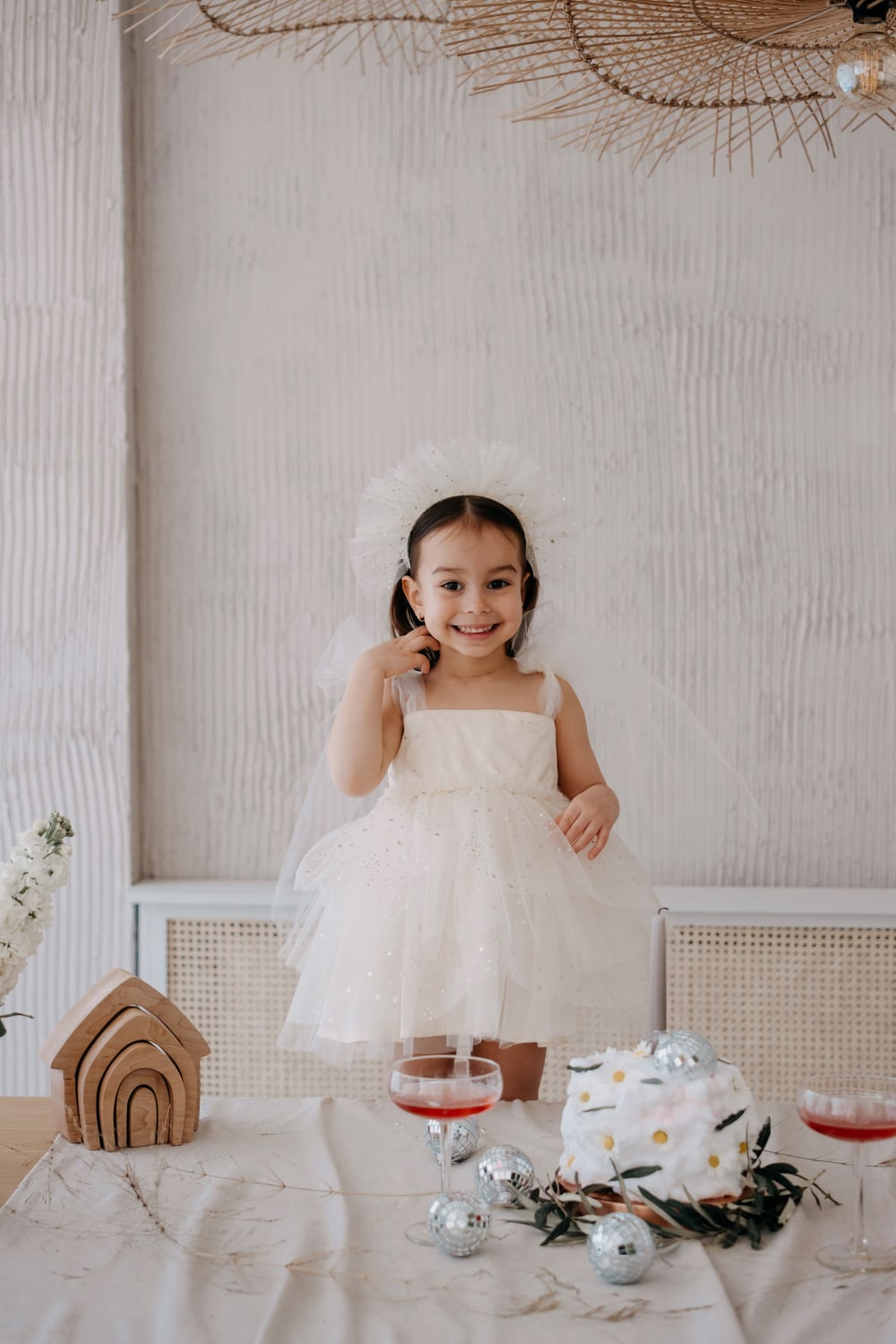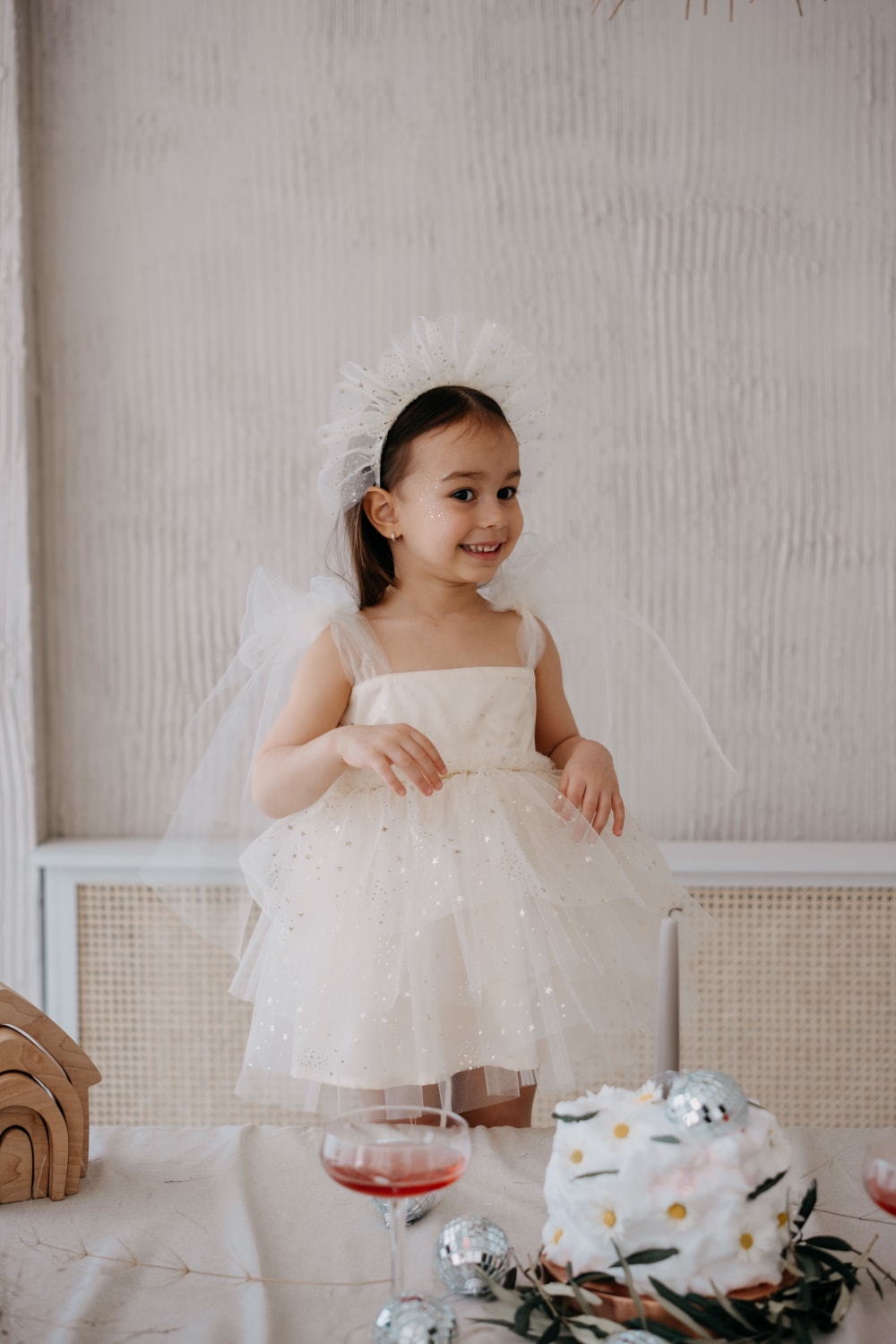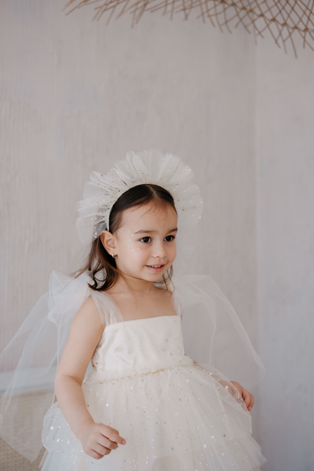 Askıları tül bağlama detaylı, saten astarlı, yıldız figürlü beyaz parti elbisesi. Elde üretim.