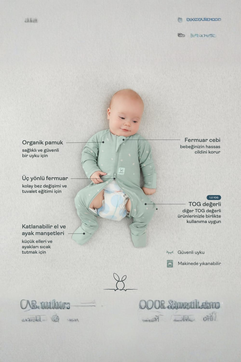- Fermuar cebi ile bebeğinizin hassas cildini korur