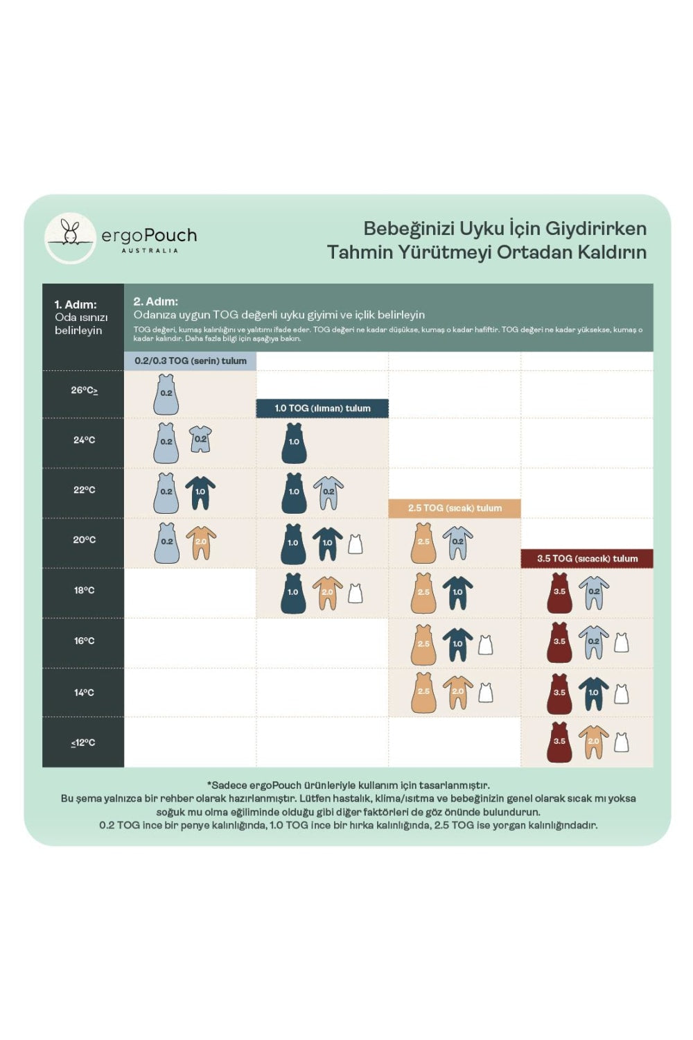 Her bebek farklı olduğundan, en uygun kombinasyonu kendiniz deneyerek bulabilirsiniz. Çoğu markanın TOG değerleri farklı olabilir. ergoPouch ürünleri için ürün görsellerinde bulunan TOG tablomuza göz atmanızı öneririz. Açık mavi 0.2 TOG, koyu lacivert 1.0 TOG ürünlerimizi temsil eder.